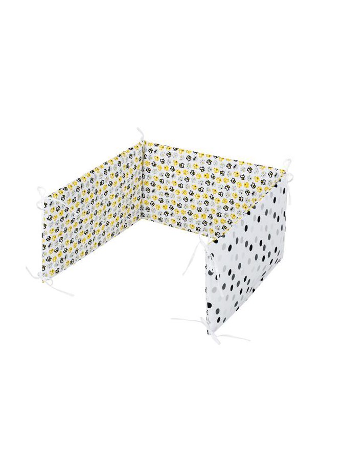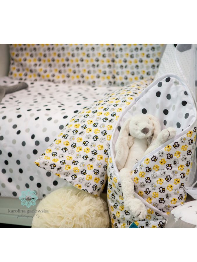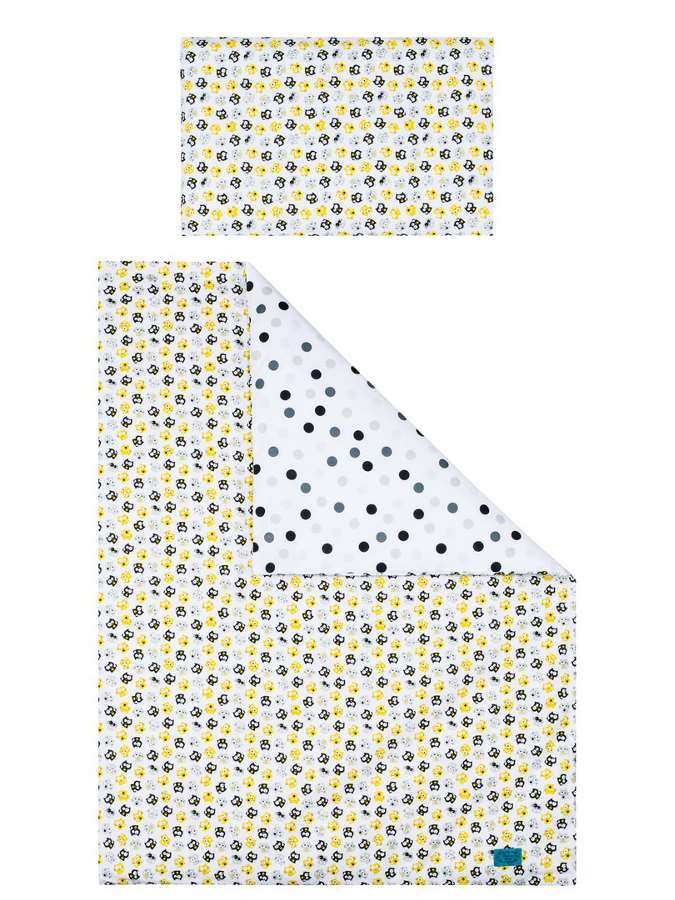 Belisima Kittens 3 piece cotton crib set for babies. One side of the set is printed with polka dots and the other side is printed with pictures of kittens. It is made of soft, pleasant material. It includes a pillowcase approx. 40x60 cm, a duvet cover approx. 90x120 cm and a fitted sheet approx. 31x175 cm. The material is 100% cotton.