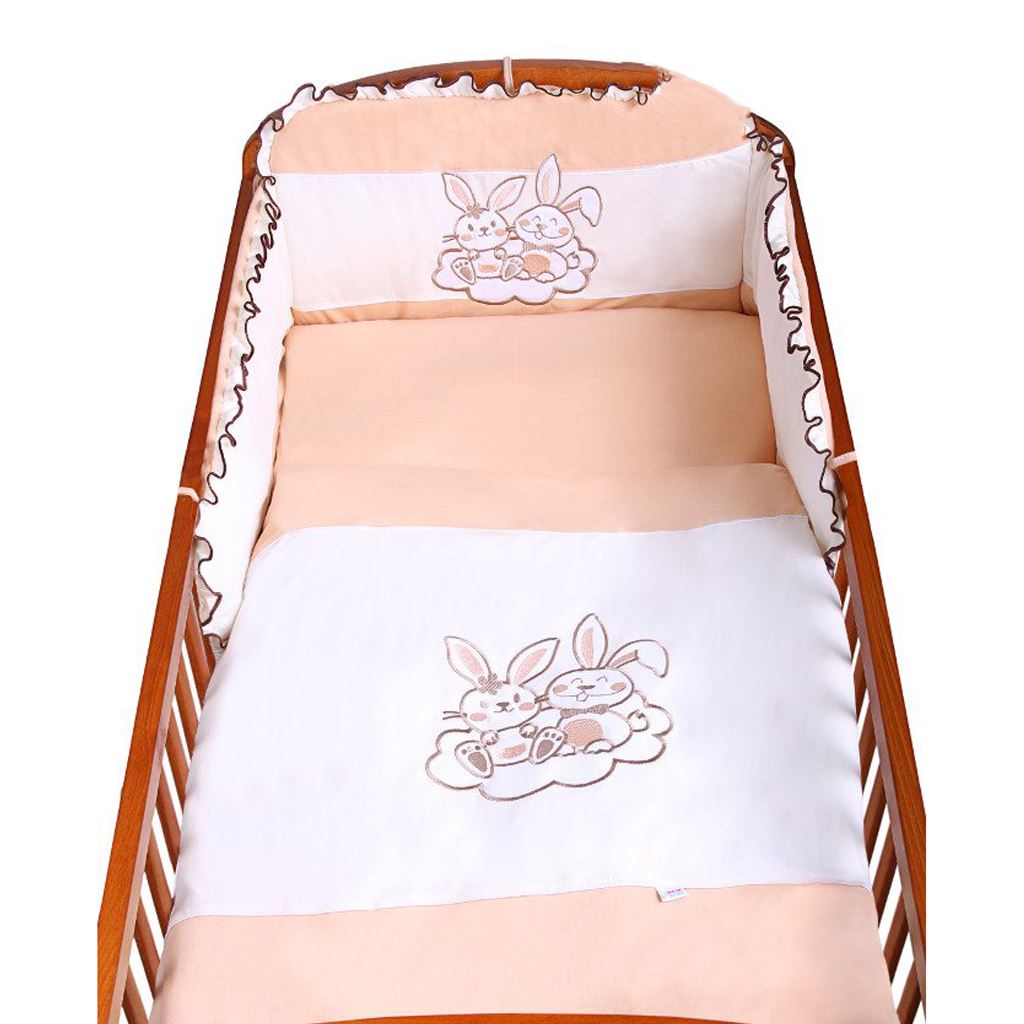 Beautiful New Baby Bunnies 3 piece cotton crib set for babies. The set includes a pillowcase, a duvet cover and a fitted sheet. The set is decorated with a large picture of bunnies, contrasting piping, ruffles and pleasant colours. The pillow is solid colour, the duvet cover has a picture of bunnies and the mantle has a ruffle, picture of bunnies and has laces to attach to the cot. It is made of soft, comfortable material. Composition: cover 80% cotton, 20% polyester, filling 100% polyester. Dimensions: pillow approx. 40x60 cm, duvet approx. 100x135 cm, cover: length approx. 170 cm, centre height approx. 35 cm, side height approx. 26 cm.