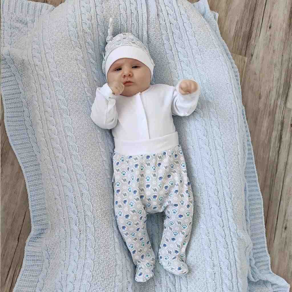Cute 3-piece cotton set by Czech brand New Baby Kiddy. The set includes a cap, body, half bottoms and is suitable for babies from birth because of its softness and softness. The half bottoms are decorated with a cute baby print. There is a wider elasticated waistband. The long-sleeved, solid-coloured bodysuit has stud fastenings all along the length and between the legs making it easy to dress and change. The cap is decorated with a cute baby print with a knot at the top. The brim is wide and does not press on the baby's head. The set is made of nice and high quality material in which your baby will feel comfortable. 100% cotton.