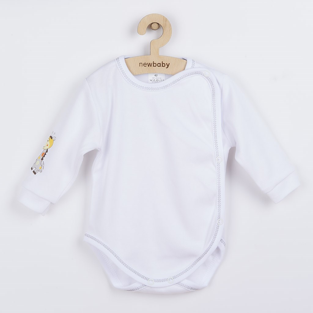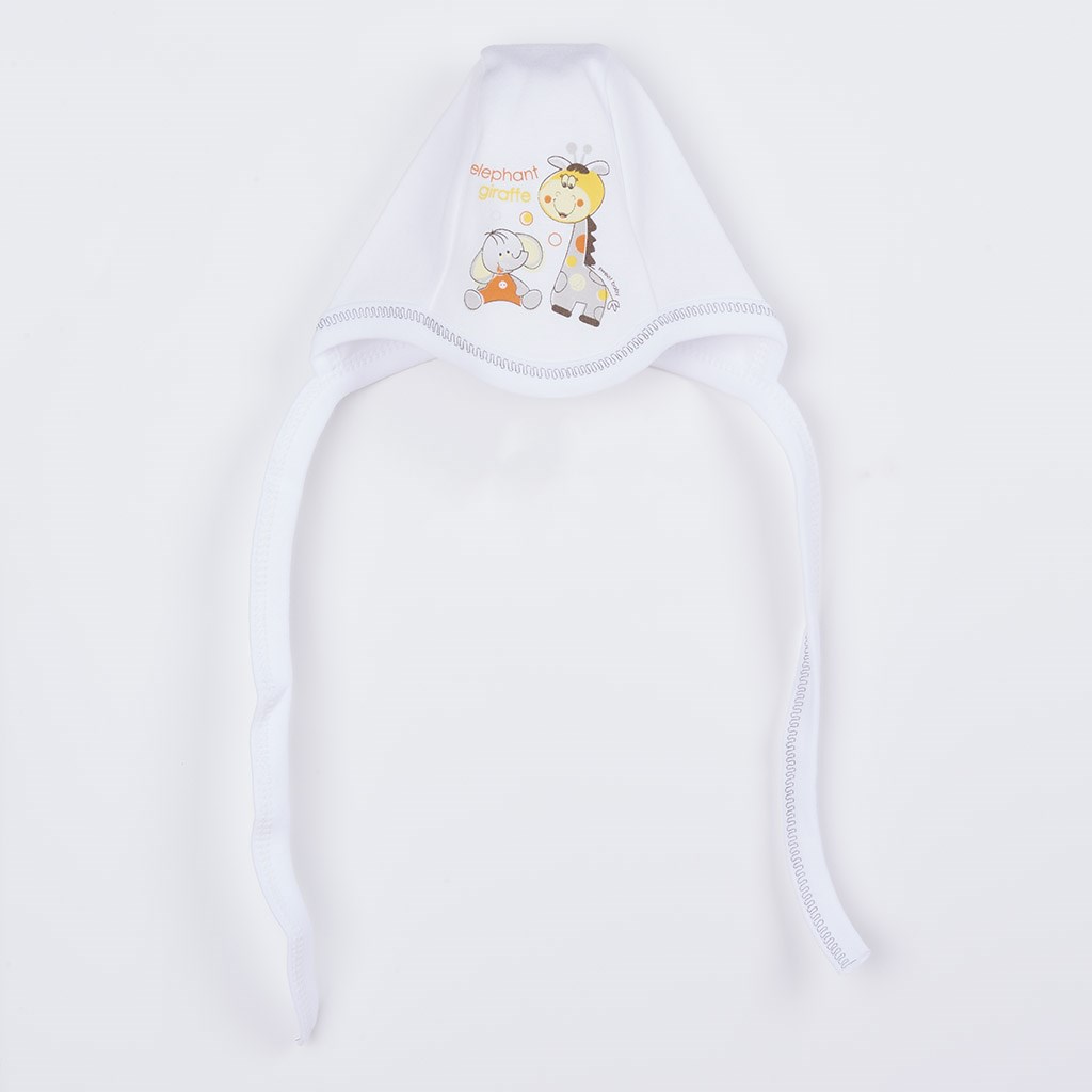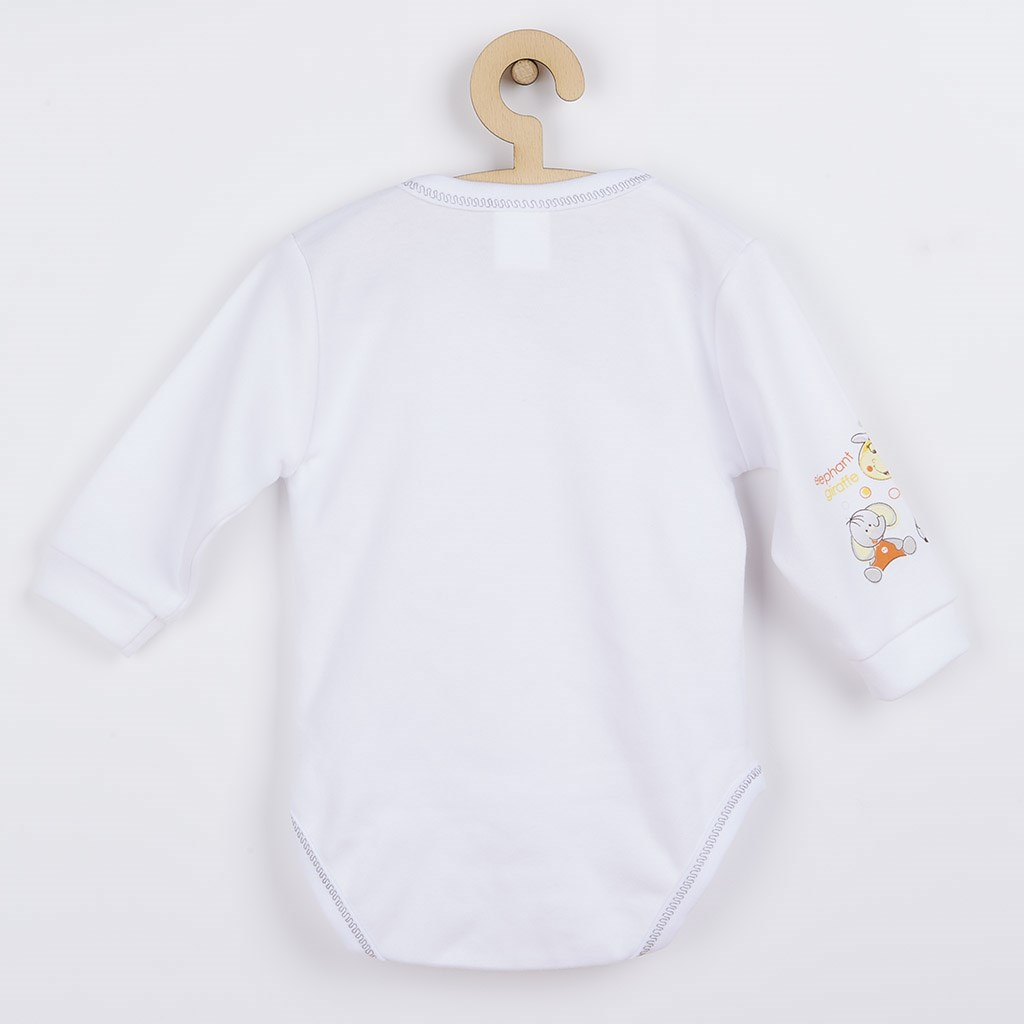 Beautiful 4 piece cotton baby set New Baby. Set includes a cap with lace-up fastening, long sleeve bodysuit with side fastening, onesie and gloves. The cap, bodysuit and onesie have a cheerful picture printed on them. The colours used for printing are certified and suitable for babies. The set is made of nice and high quality material in which your baby will feel comfortable. The bodysuit has a practical stud fastening along the entire length and between the legs, making it easy to dress and change the baby. The onesies have stud fastenings on the straps and between the legs. 100% cotton. Dimensions: onesies - chest circumference 48 cm, length from shoulder straps 49 cm, length from crotch approx. 17 cm, body - chest circumference 44 cm, length from shoulder straps 34 cm, sleeve length approx. 19 cm. Sleeves 9 cm. Cap - circumference around the head 38 cm.