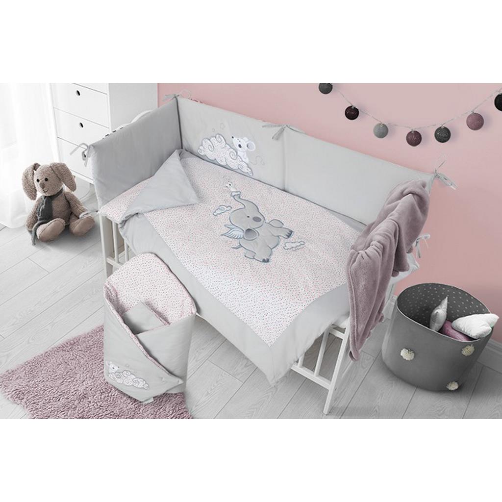 Beautiful Belisima Friends 5 piece cotton crib set for babies. The set is decorated with a cute elephant. It is made of soft, pleasant material. The set includes a pillowcase approx. 40x60 cm, a duvet cover approx. 100x135 cm, a mantle approx. 180 cm, a pillow and a duvet. The material is 100% cotton.