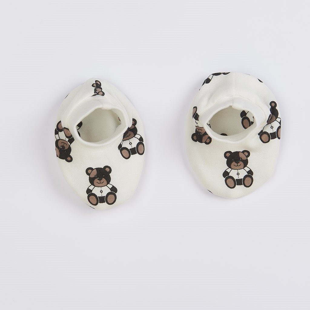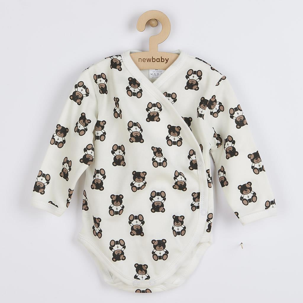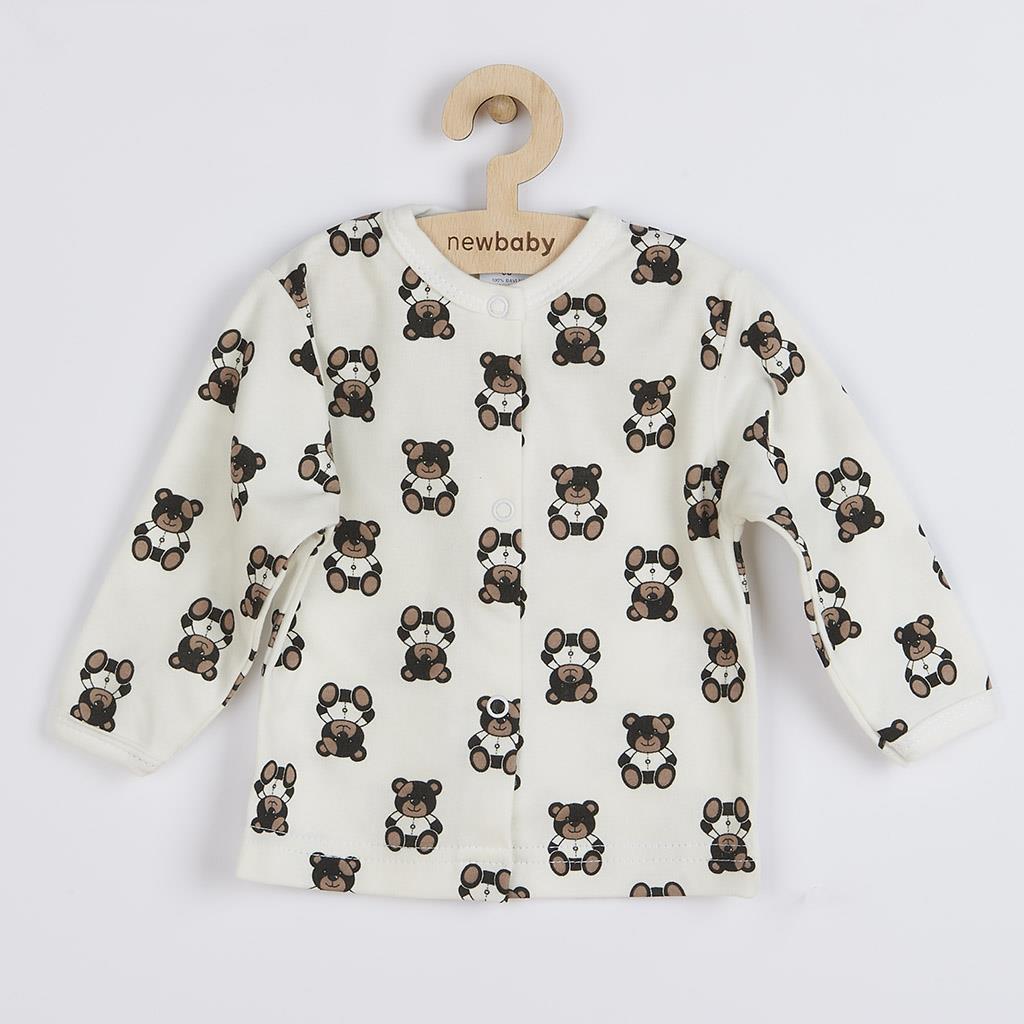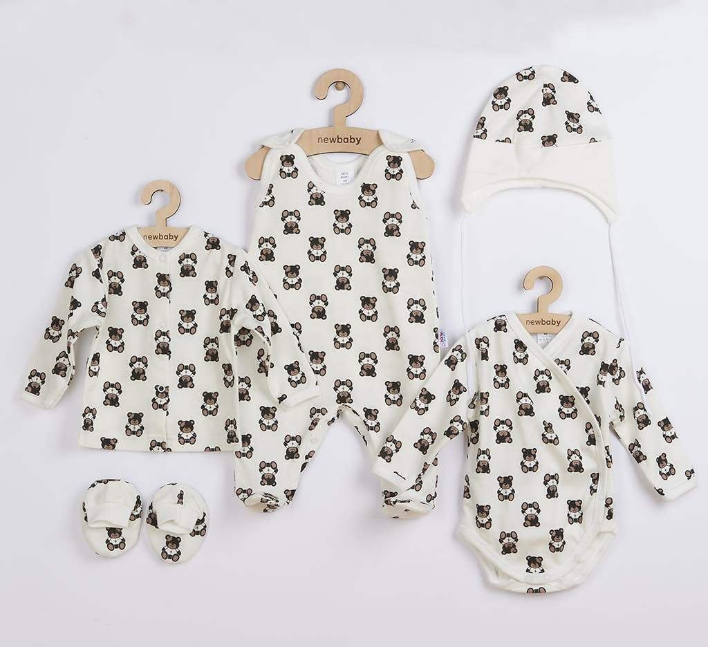 Cute 5 piece baby set by Czech brand New Baby Bear for babies. The set is made of very nice, soft and high quality material that is suitable for babies and is suitable not only for the maternity ward. It includes a full-sleeved body with long sleeves, onesies, a jacket, a hat and a pair of caps. The whole set is printed with cute teddy bears. The body has a full-length studded side fastening. The onesies have stud fastenings on the shoulder straps and between the legs making dressing and changing easier. The jacket has a full length stud fastening. The cap is beautifully shaped on the ears and ties with laces, which makes it hold well on the baby's head and does not fall off. It is very practical and does not press on the baby's head. The caps are without fastening with a tightening cuff. The whole set has a beautiful baby design. It is designed with the baby's needs in mind and is also suitable as a nice gift. 100% cotton.