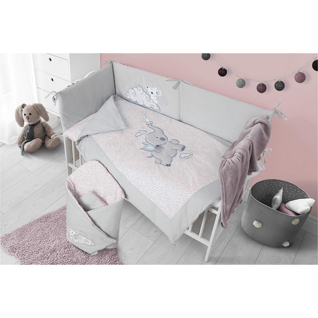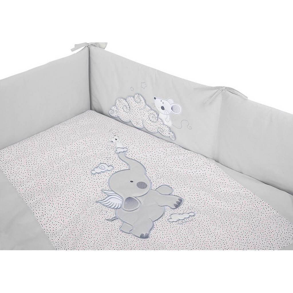Beautiful Belisima Friends 6 piece cotton crib set for babies. The set is decorated with a cute elephant. It is made of soft, pleasant material. The set includes a pillowcase approx. 40x60 cm, a duvet cover approx. 100x135 cm, a mantle approx. 180 cm, a pillow and a duvet, a canopy. The material is 100% cotton.