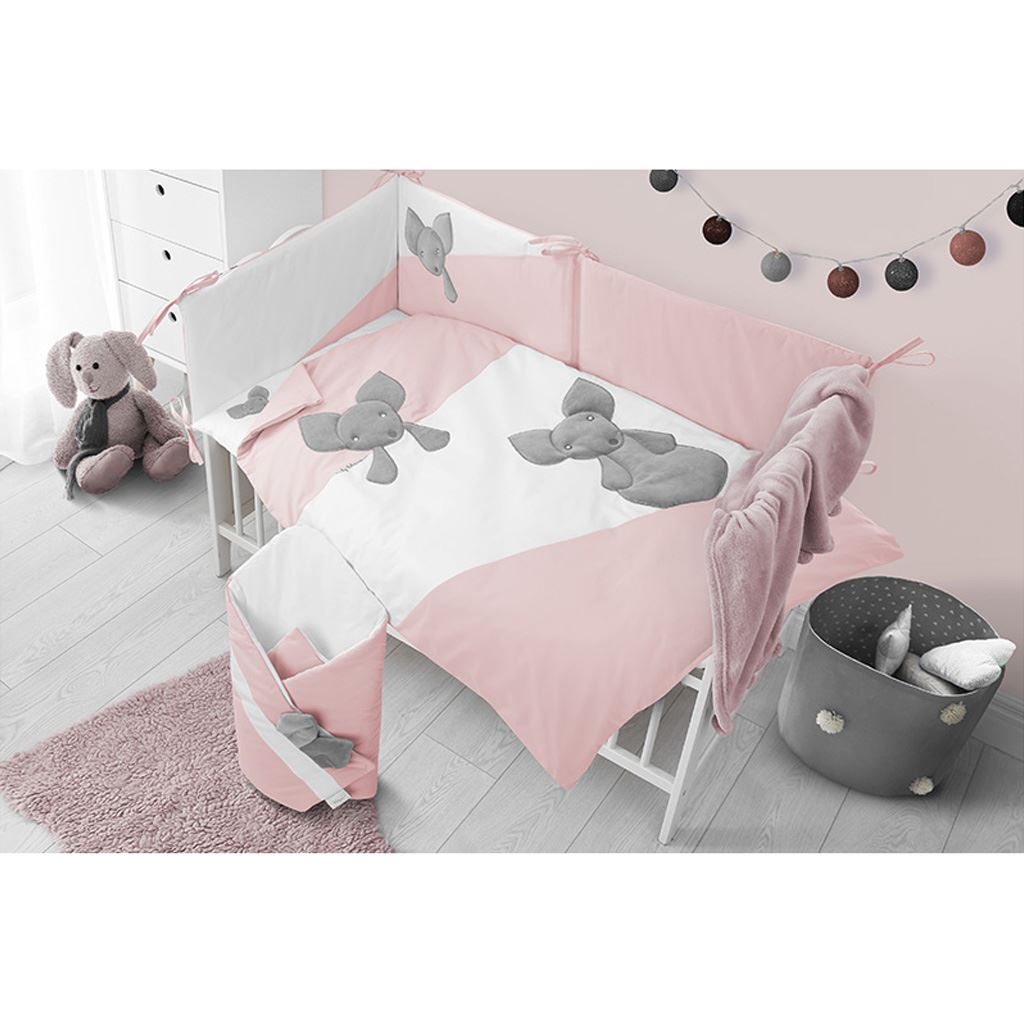 Beautiful Belisima Mouse 6 piece cotton crib set for babies. The set is decorated with a beautiful mouse motif. It is made of soft, pleasant material. The set includes a pillowcase approx. 40x60 cm, a duvet cover approx. 90x120 cm, a mantle approx. 180 cm, a pillow and a duvet, a canopy. The material is 100% cotton.
