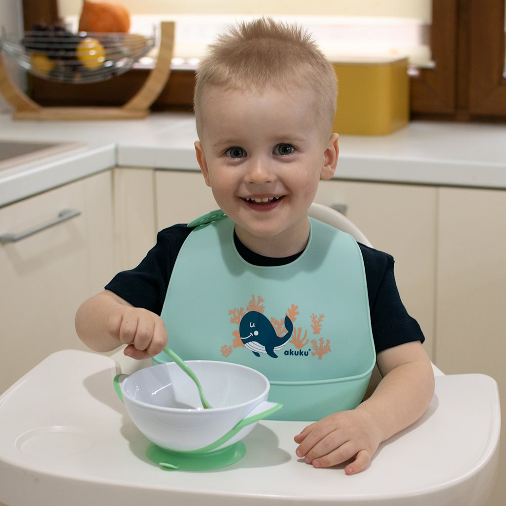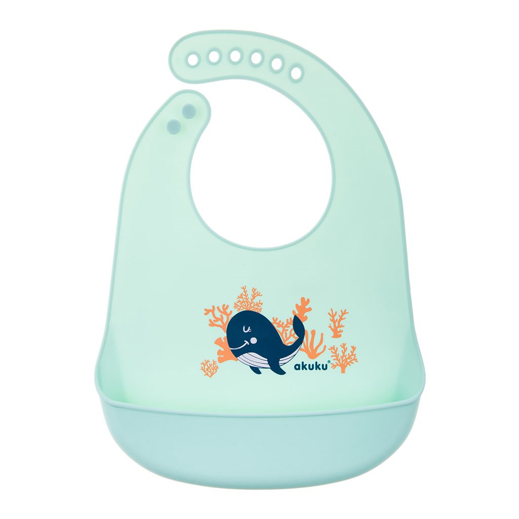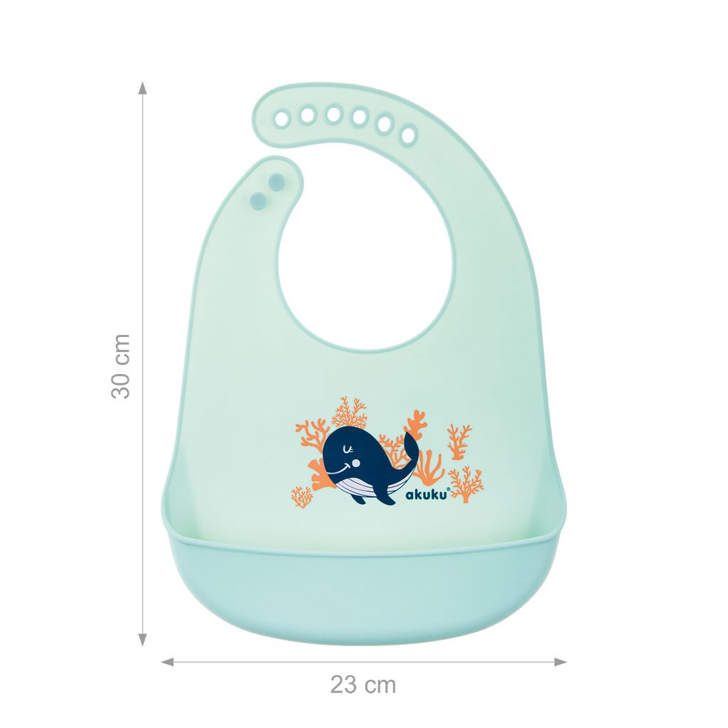 The adjustable silicone bib AKUKU with pocket is very practical - thanks to the pocket it prevents soiling of clothes. The adjustable clasp makes it easy for every mom to adjust the size of the bib to her baby. It will come in handy at home and on walks. The bib is made of 100% lightweight and safe silicone. Its composition is completely safe and contains no substances that could irritate baby's delicate skin. It is extremely soft and pleasant to the touch. It does not contain Bisphenol A.