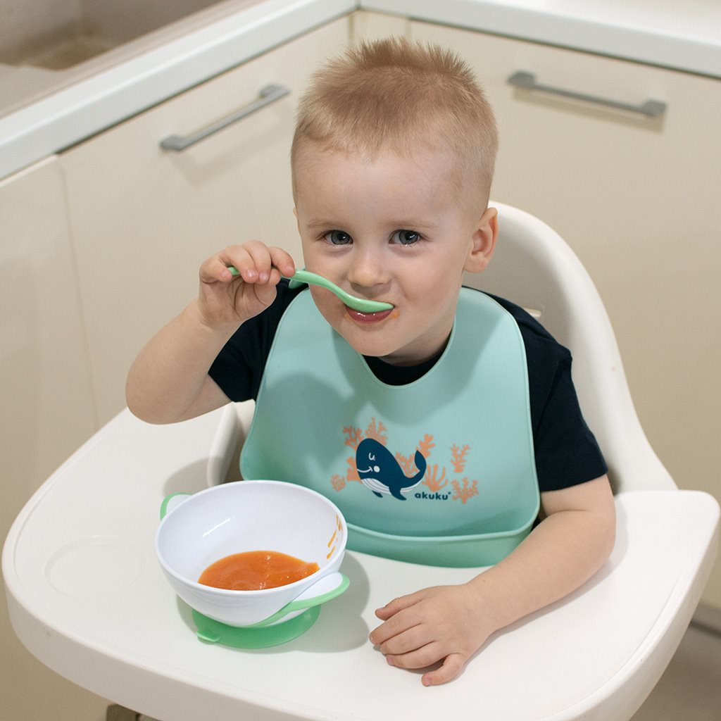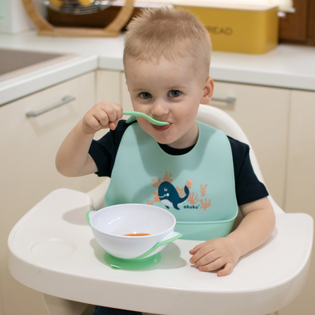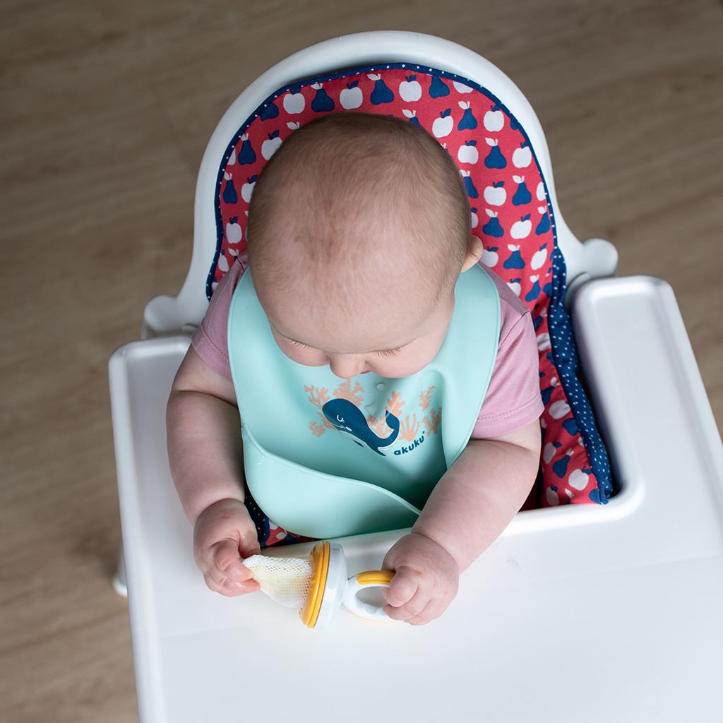 The adjustable silicone bib AKUKU with pocket is very practical - thanks to the pocket it prevents soiling of clothes. The adjustable clasp makes it easy for every mom to adjust the size of the bib to her baby. It will come in handy at home and on walks. The bib is made of 100% lightweight and safe silicone. Its composition is completely safe and contains no substances that could irritate baby's delicate skin. It is extremely soft and pleasant to the touch. It does not contain Bisphenol A.
