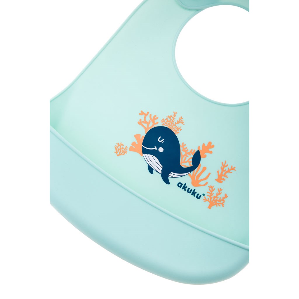 Adjustable baby silicone bib with pocket Akuku whale mint