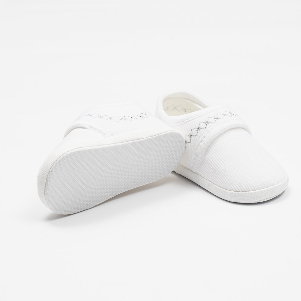 New Baby baby booties for babies. Beautiful booties with a modern Velcro look, decorated with silver embroidery. The slippers fit close to the foot and have a wide inside, allowing free movement of the toes and muscles. The product is not designed for walking. They are very lightweight with a thin synthetic sole. Composition: 100% polyester. Sole: BPA-free synthetic PVC material. Insole length 13 cm. Designed for children 12-18 months. Supplied in a practical box. Please note: sometimes there is a paper liner under the textile liner to hold the shape of the slipper. Please remove this paper liner before first use.