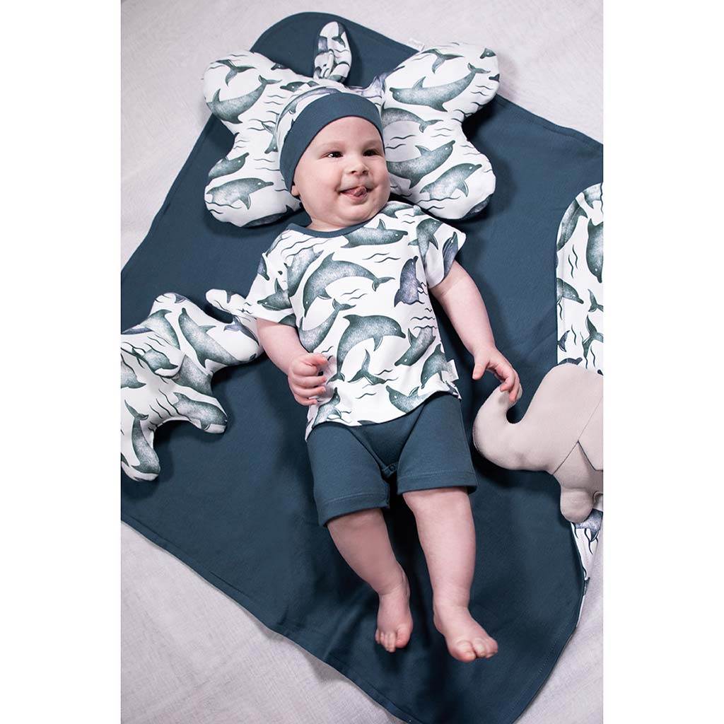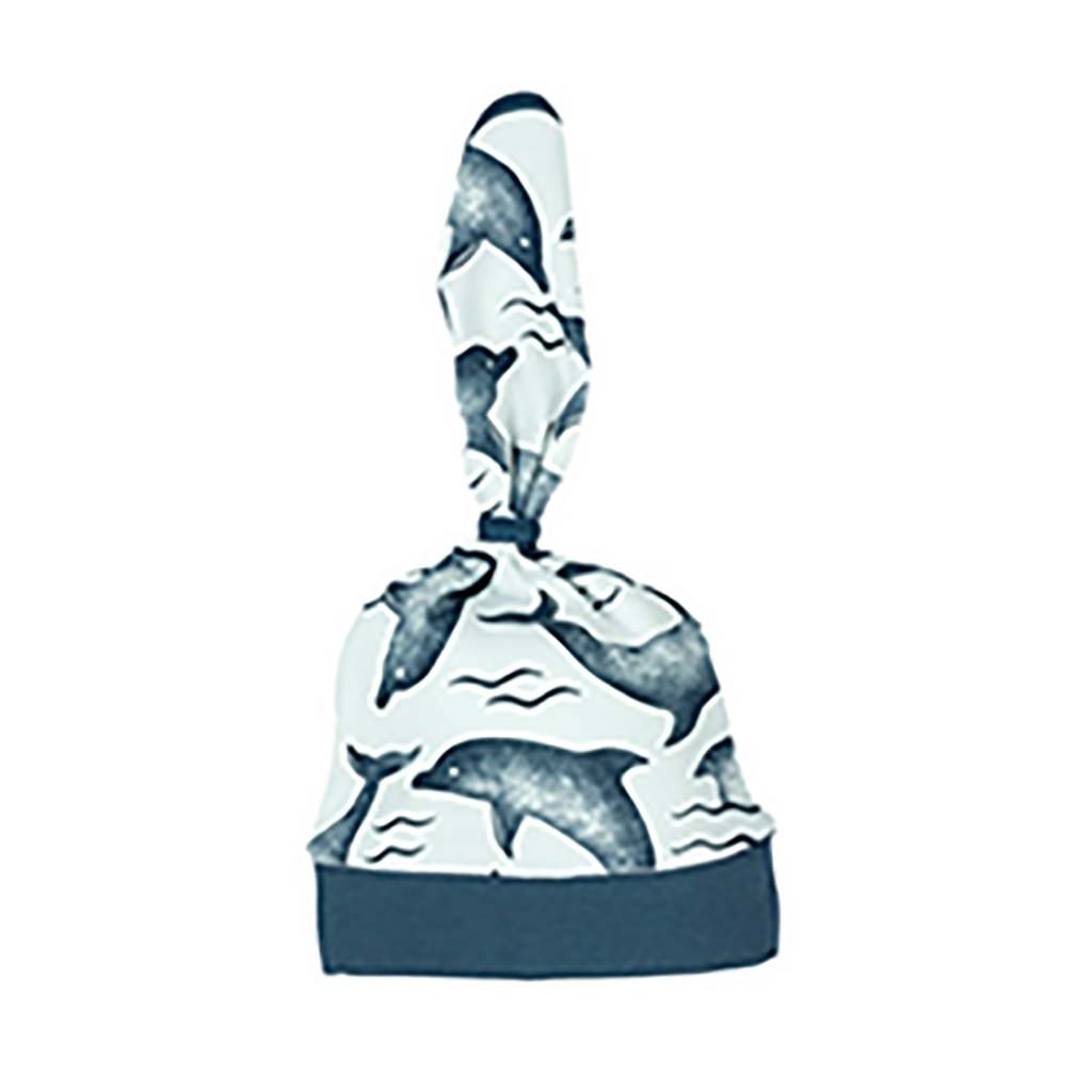Beautiful cotton baby cap-scarf Nicol Dolphin. The cap is sewn in the style of a scarf with an elasticated hem with a dolphin print. Thanks to the pleasant and high-quality material, the baby will feel very pleasant and comfortable. 100% cotton.
