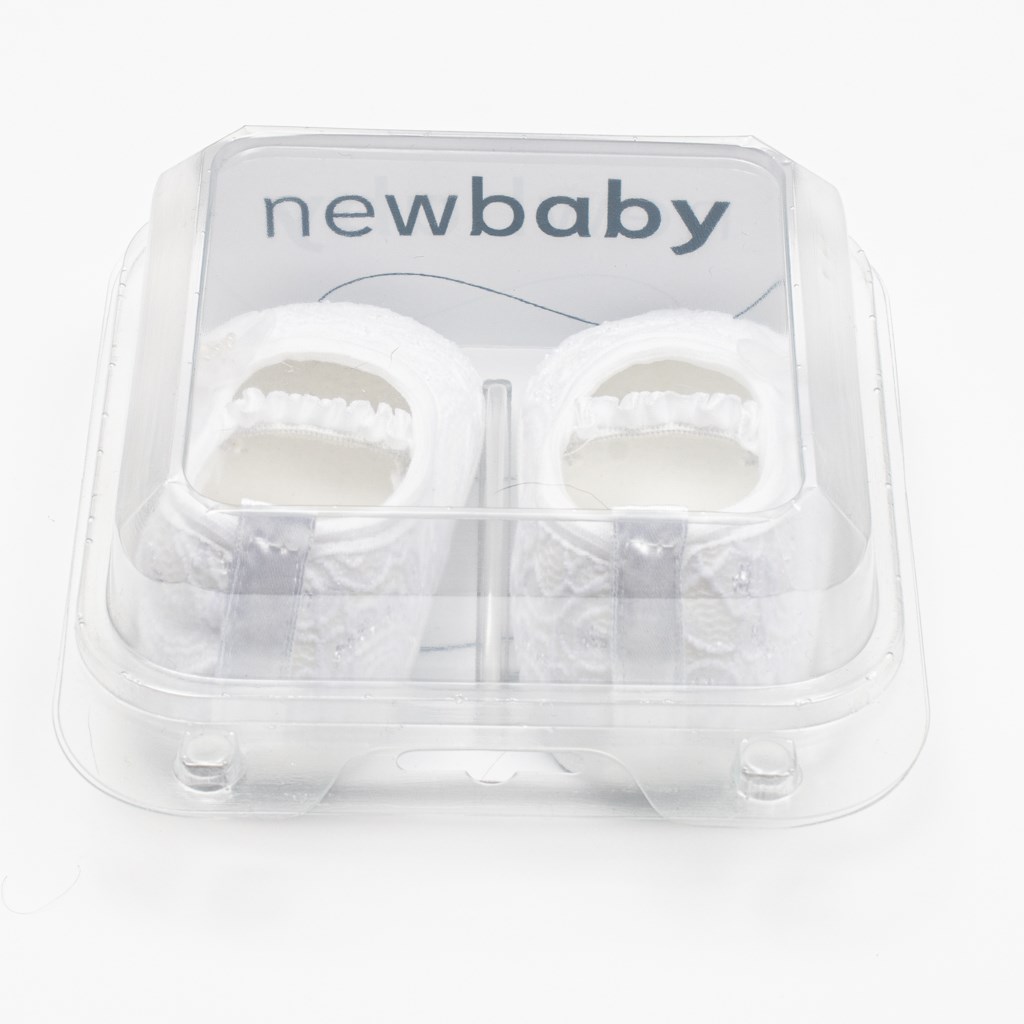 New Baby baby booties for babies. Beautiful booties are in the style of girls sandals with a modern look. The slippers fit close to the foot and have a wide inside, allowing free movement of the toes and muscles. The product is not designed for walking. They are very lightweight with a thin synthetic sole. Composition: lace:100% polyester. Sole: BPA-free synthetic PVC material. Insole length 13 cm. Designed for children 12-18 months. Supplied in a practical box. Please note: sometimes there is a paper liner under the textile liner to hold the shape of the slipper. Please remove this paper liner before first use.