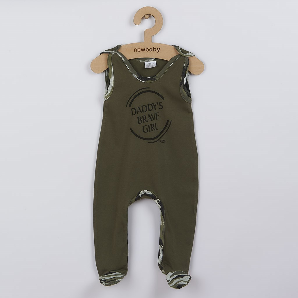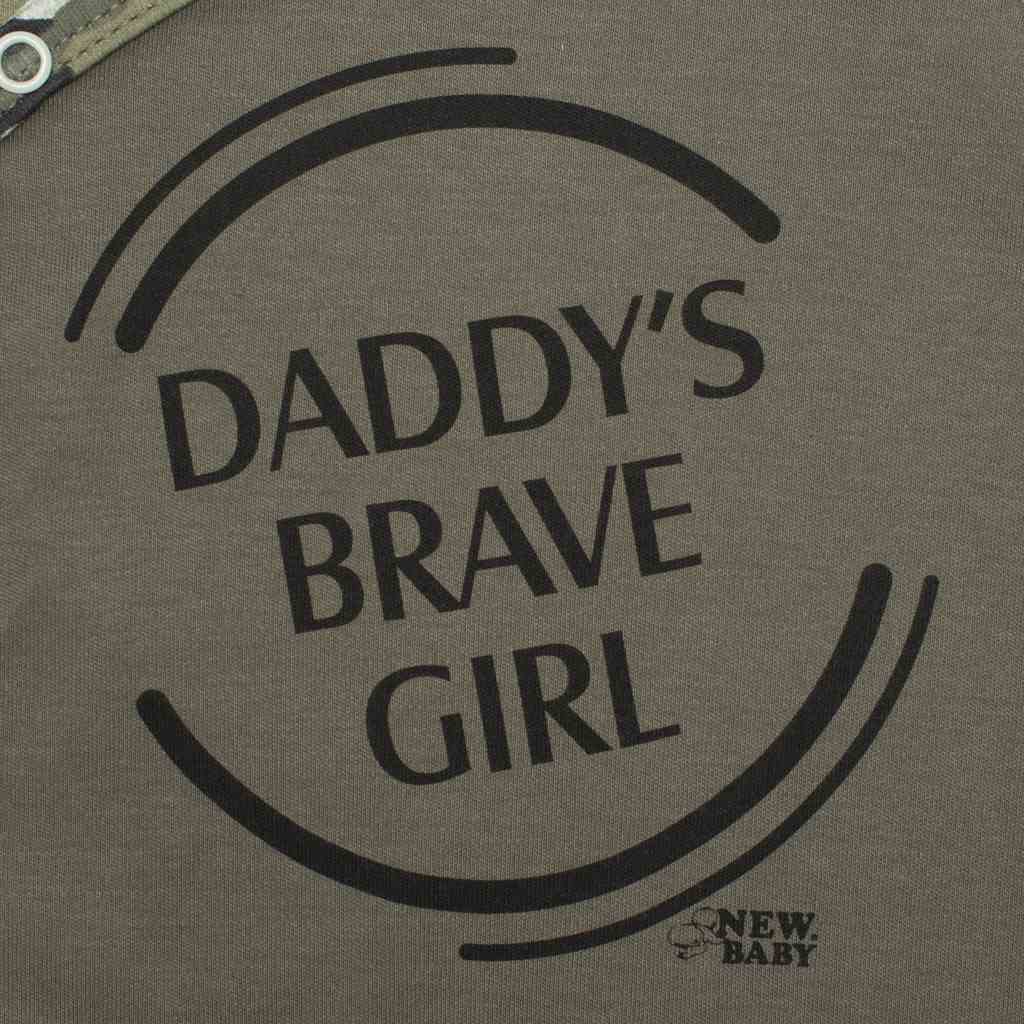 Stylish cotton baby onesies from the Czech brand New Baby Army for babies. The onesies are decorated with a camouflage pattern trim and the inscription DADDY'S BRAVE GIRL. The stud fastening on the shoulder straps and between the legs makes dressing and changing easier. The onesies are an important piece of clothing for babies. With any movement, the baby's bottom is always covered.