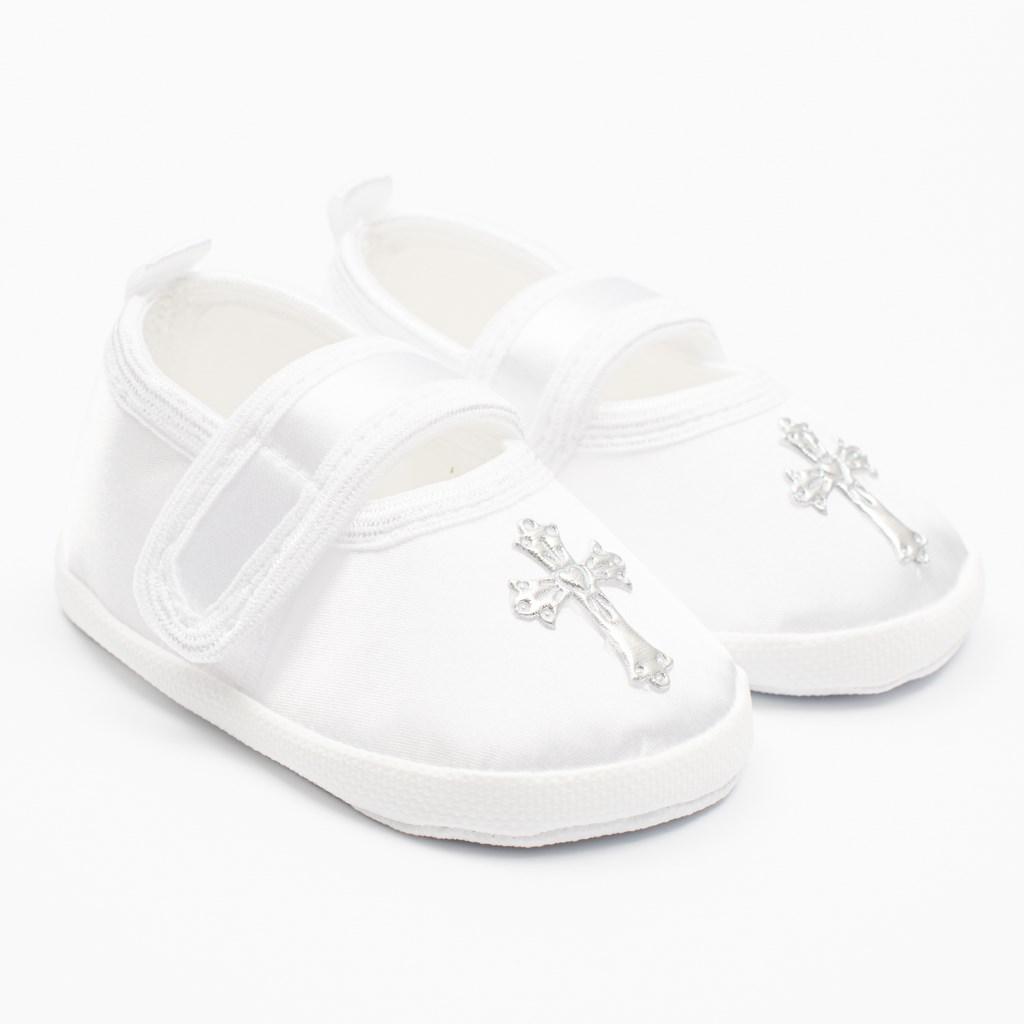 New Baby satin baby booties for babies. Beautiful satin velcro baby booties. The slippers fit snugly to the foot and have a wide inside, which allows free movement of the fingers and muscles. The product is not designed for walking. They are very lightweight with a thin synthetic sole. Composition: satin: 100% polyester. Sole: BPA-free synthetic PVC material. Insole length 11 cm. Designed for children 3-6 months. Supplied in a practical box. Please note: sometimes there is a paper liner under the textile liner to hold the shape of the slipper. Remove this paper liner before first use.