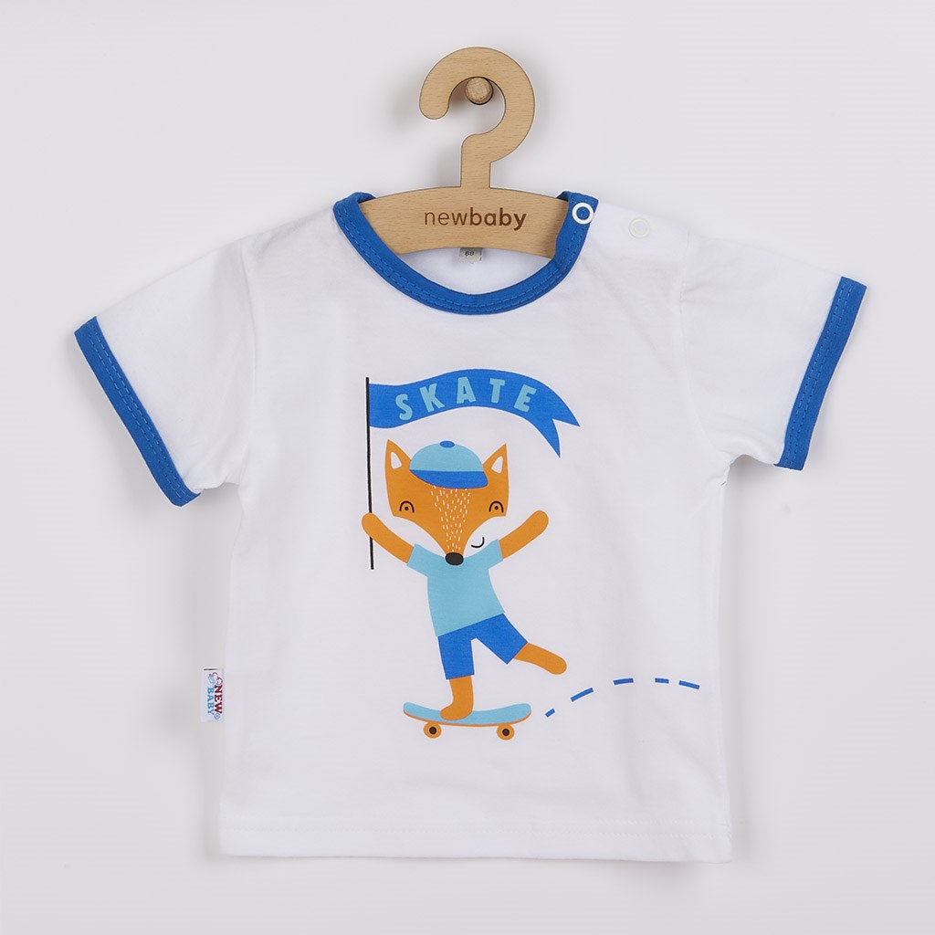 Beautiful and cool 2-piece cotton set by Czech brand New Baby Liška. Set includes a t-shirt and shorts. The short sleeved T-shirt with colourful trim around the neck and sleeves is decorated with a cheerful picture of a fox and the word SKATE. The t-shirt has a shoulder strap fastening for easy dressing. The comfortable shorts are solid colour with an elasticated waistband. A super summer hit and a useful piece for a little boy's wardrobe. The set is made with the needs of young children in mind with very soft and comfortable material. Great to use it not only in the stroller, but also for walks or as a comfortable outfit for home. It has a versatile use. Composition 100% cotton