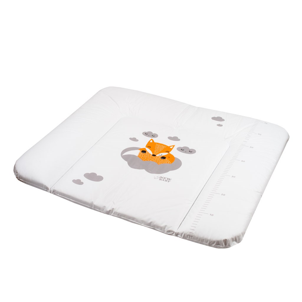 Practical shaped changing mat with modern design New Baby Fox made of waterproof plastic material with a picture of a fox and puffs. Product of Czech brand. The pad is filled with polyester and can be used on a chest of drawers or other changing place, thanks to its low weight it is mobile. It is made of the highest quality certified foil, which contains no harmful substances and is sensitive to the most delicate baby skin. Size: approx. 85x70 cm, thickness approx. 4 cm.