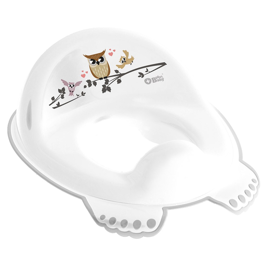 Children's colourful toilet seat with an owl picture. It is made of high quality plastic material. It is easy to wash and thanks to its shape it guarantees your child's safety and comfort. The raised front part prevents urine leakage. Ideal for children who are learning to go to the toilet on their own. Fits most toilet seats. The underside has a non-slip finish for your child's added safety. Dimensions: approx. 38x32 cm.