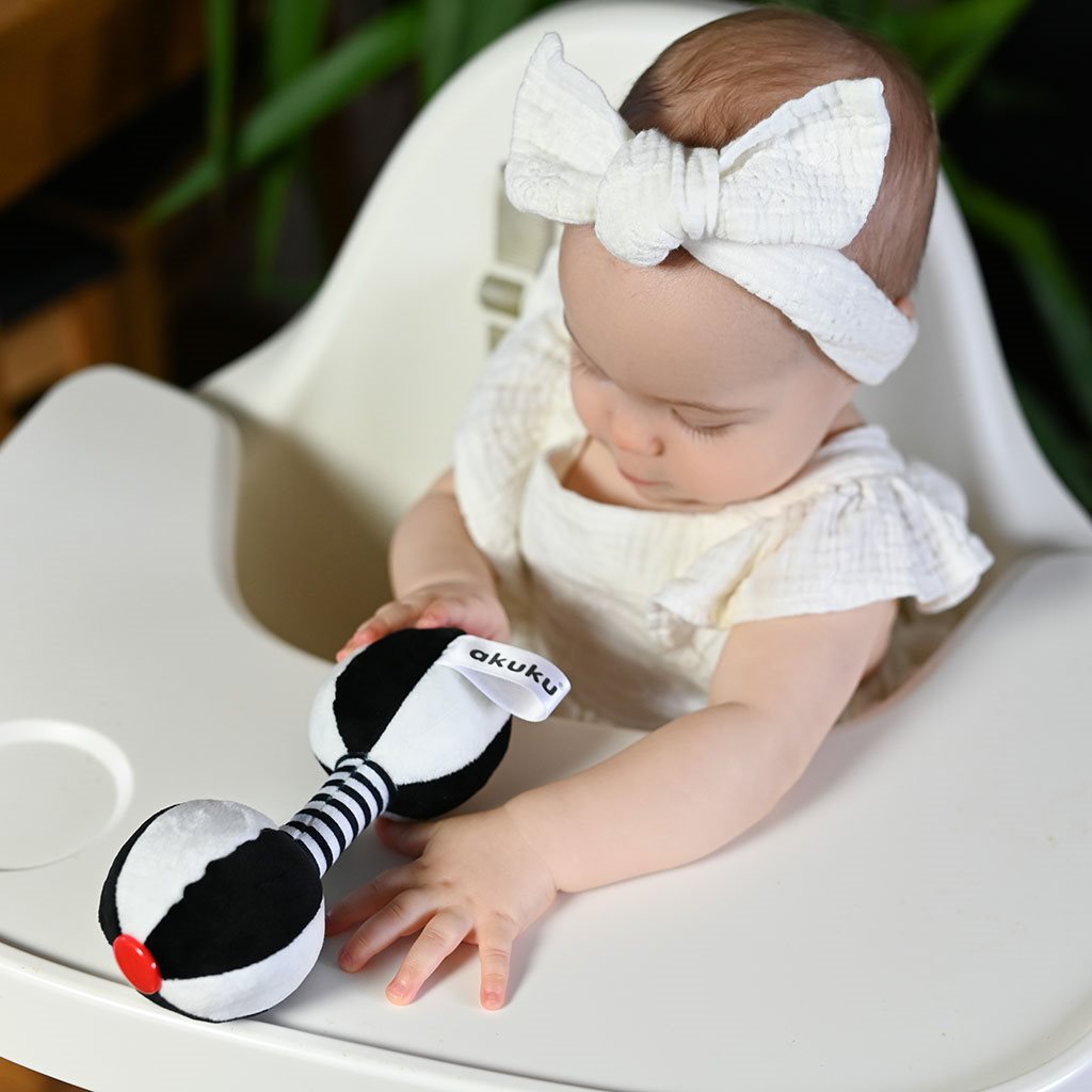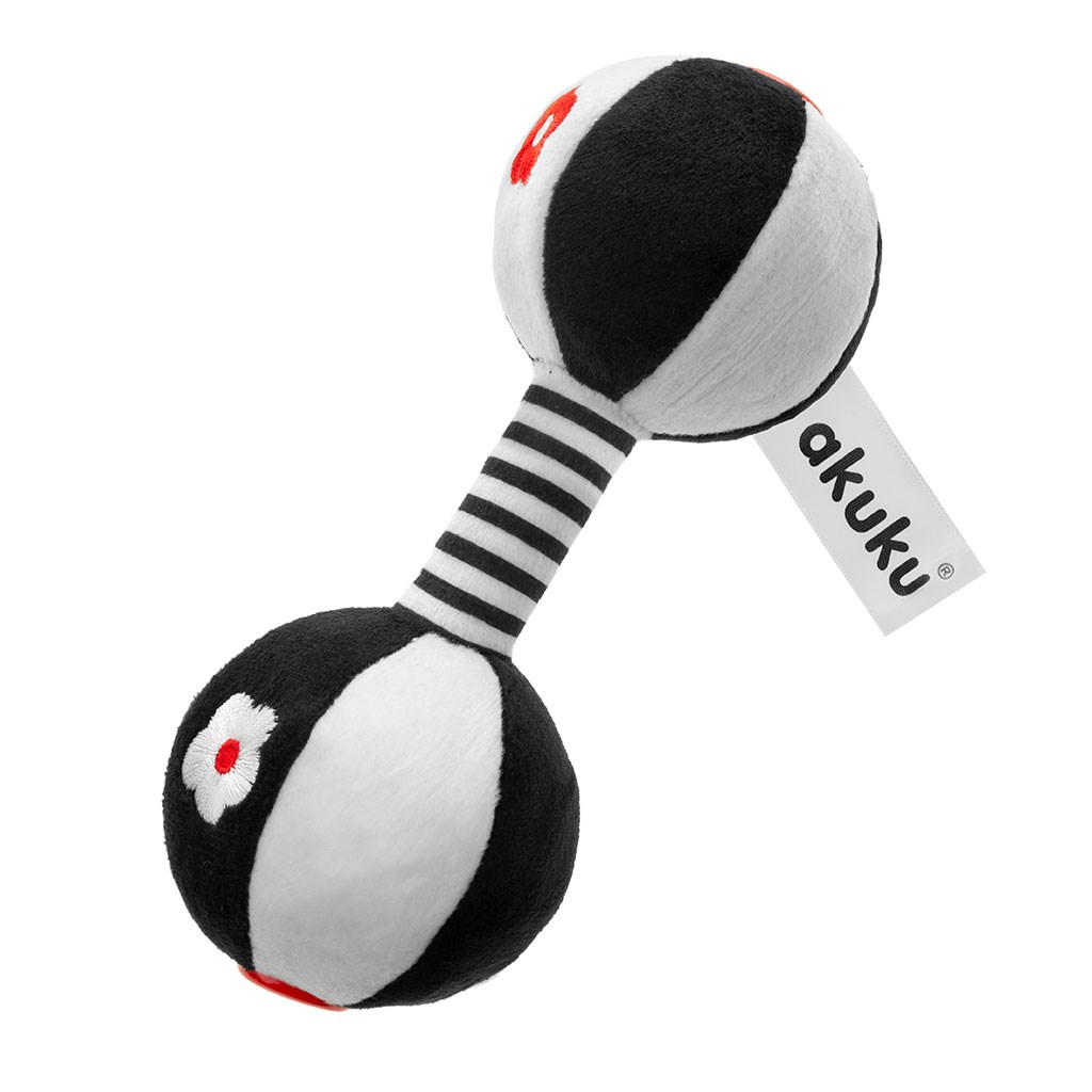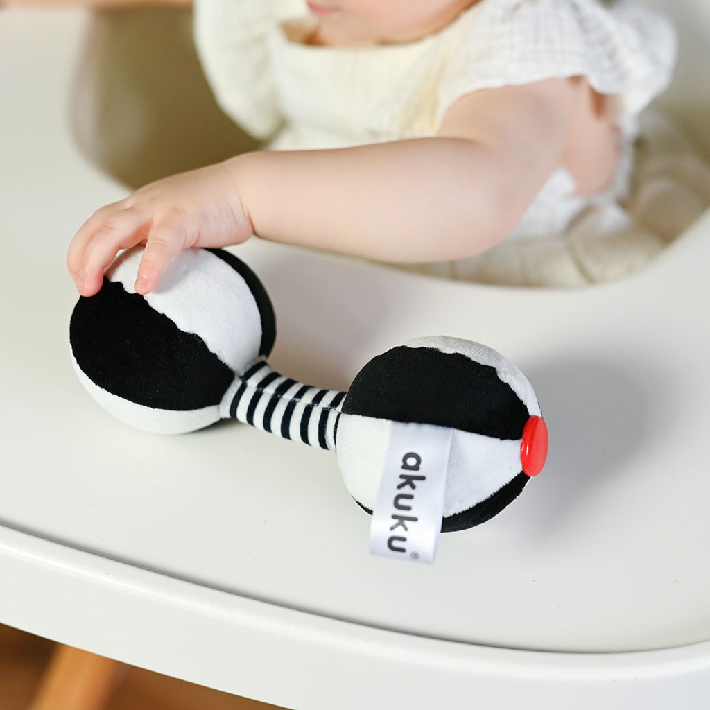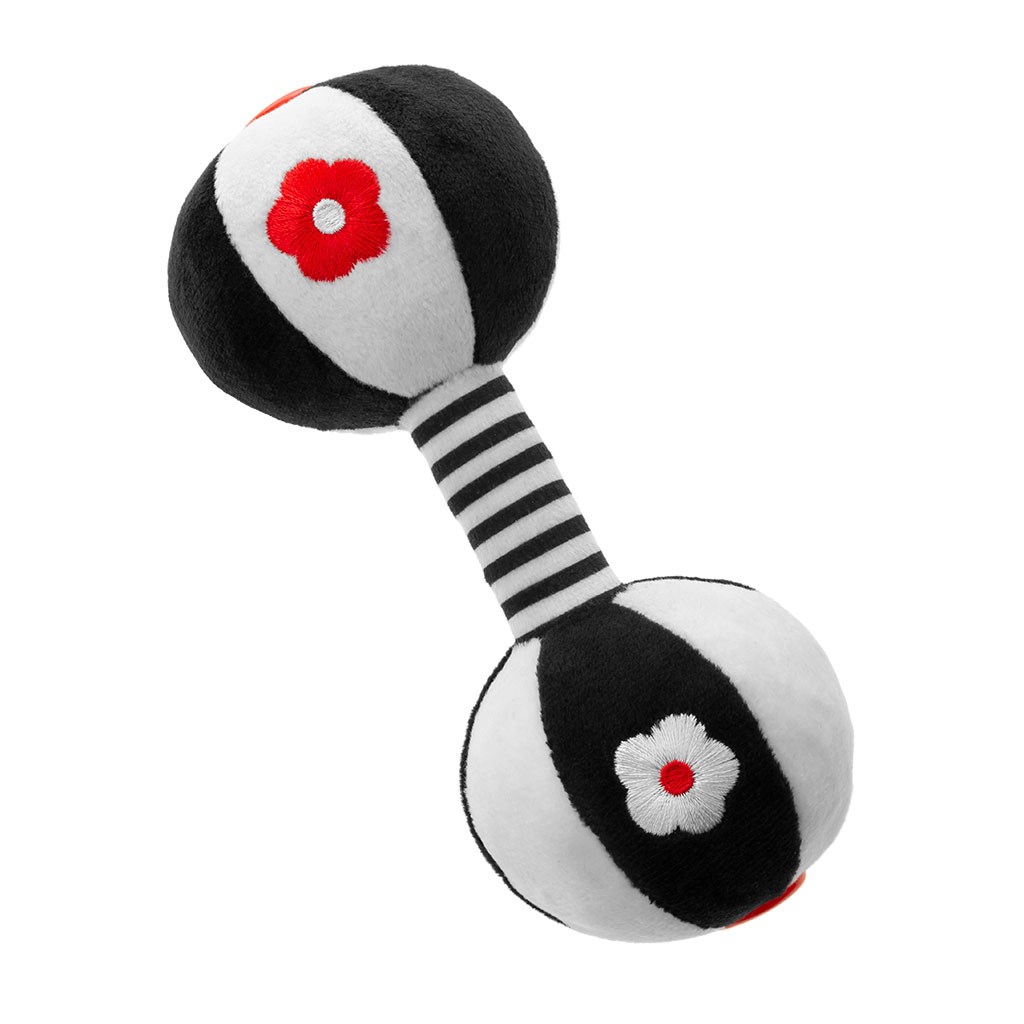 The soft sensory contrast toy in the shape of a dumbbell is sure to delight any baby. It is made of pleasant plush fabric that does not irritate sensitive baby skin. It supports baby's development from the first days. The toy stimulates the eyesight thanks to the specially used colours, which the baby can see from birth. Perfectly stimulates the development of the child's visual, auditory and motor coordination. The bells placed inside allow the child to recognize the first sounds and develops his hearing. It is soft and pleasant to the touch.
