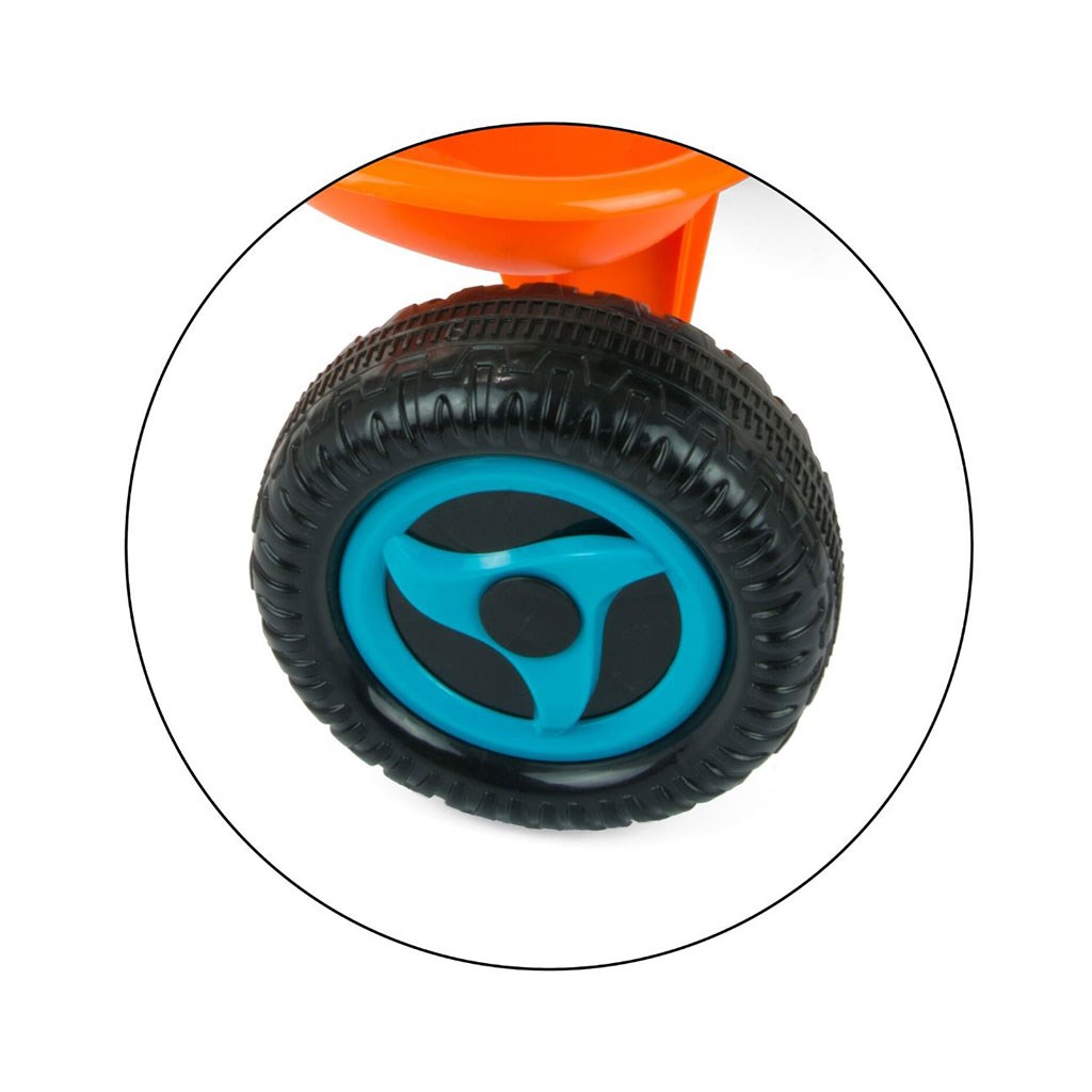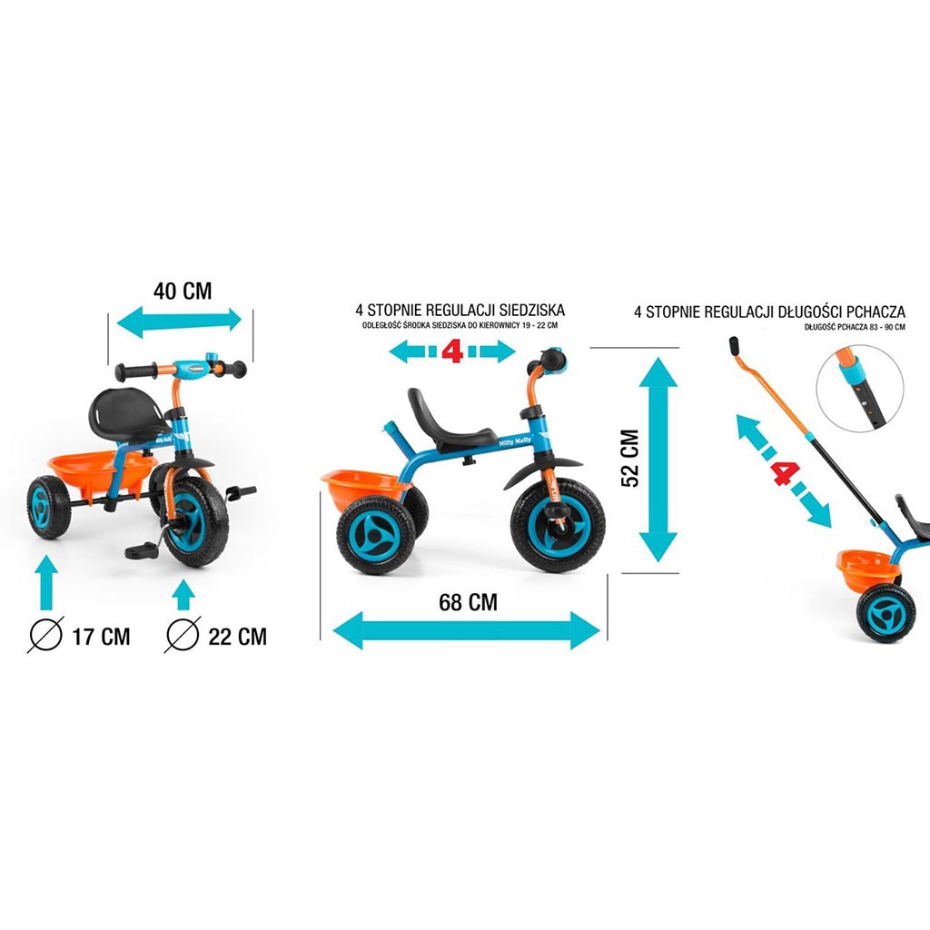 Children's pedal tricycle Boby TURBO. The tricycle is designed for children aged 18 months to 3 years. It is made of high quality and durable materials, ideal for walking. The tricycle can be controlled by both the child and the parent. The pedals can be locked and the tricycle can then be controlled using the push handle, which can be removed if necessary. There is a plastic removable basket for storing toys or baby's necessities. The seat can be adjusted in height to four positions. For maximum child safety, the tricycle has a five-point seat belt.