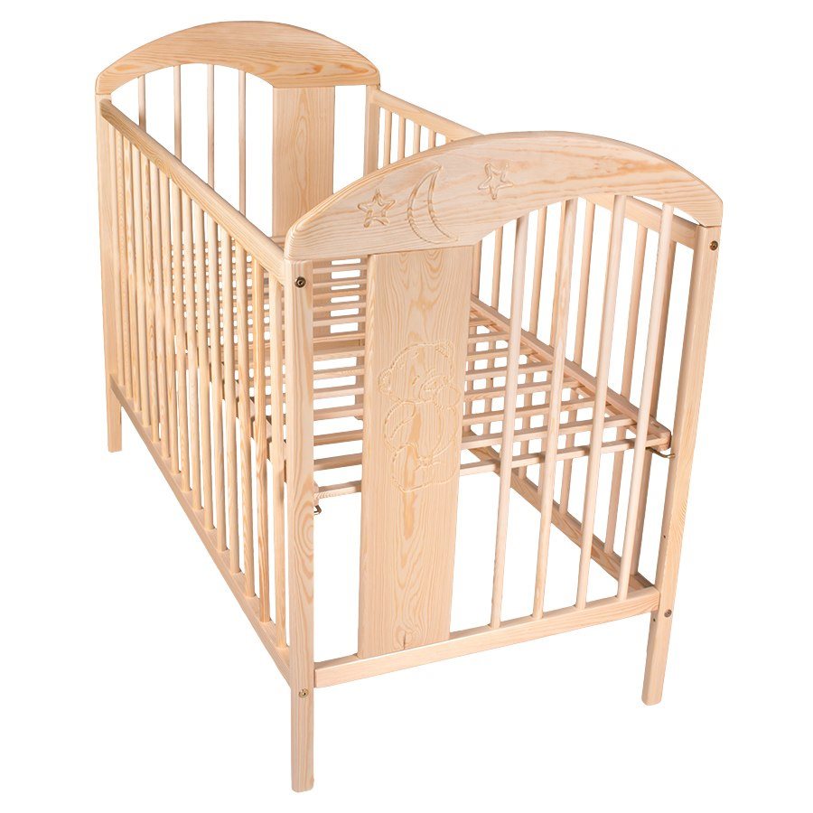 Classic size crib with arches on the headboard and carved motif, made of high quality pine wood. Mattress size 120x60 cm. During the entire production process, emphasis is placed on the quality of workmanship and the safety of the materials and paints used, taking into account the purpose of the furniture. The mattress is not part of the cot.