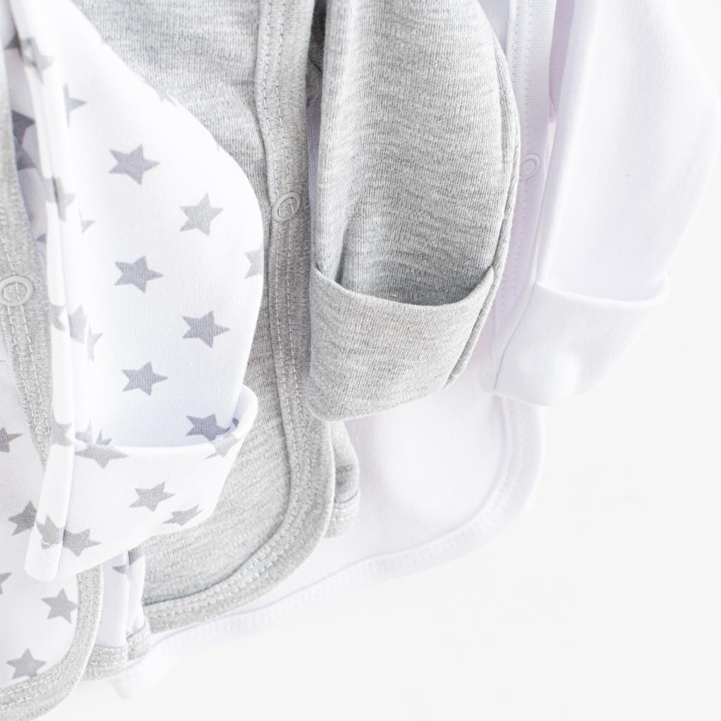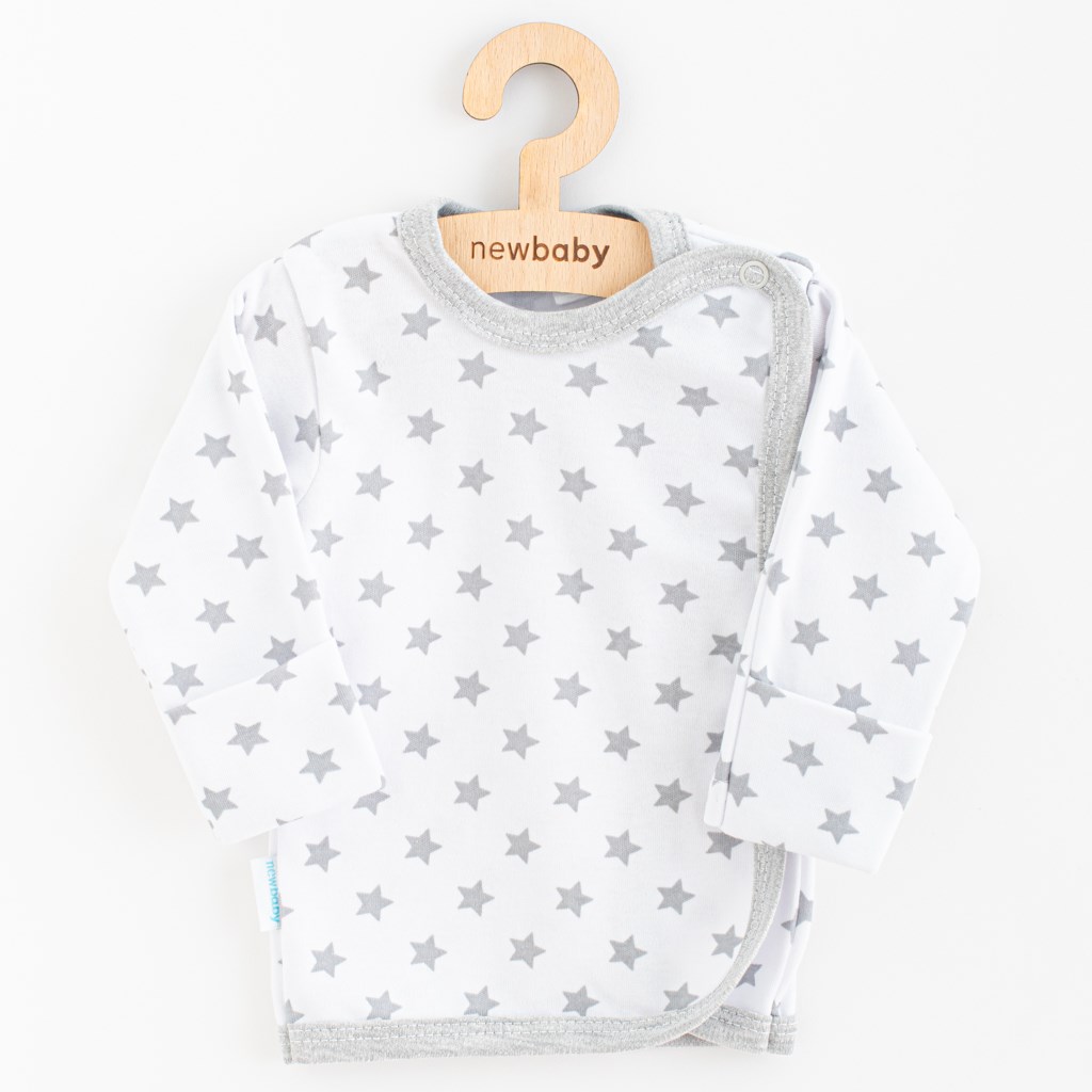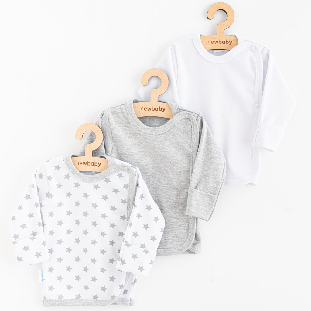 Beautiful classic baby shirt New Baby Classic II Uni. The shirt fastens with studs on the shoulder and side, which makes dressing and changing easier. The sleeves can be rolled up. The rolled up sleeve prevents scratching by baby's fingernails and keeps baby's hands warm. The shirt is made of soft, cuddly and high quality material in which the baby will feel very comfortable. Customer satisfaction is very important to New Baby and that is why we offer you our new high quality Classic II collection. The cost-effective package includes 3 pieces - 1x - white onesie, 1x - stars onesie, 1x - grey onesie. 100% cotton.