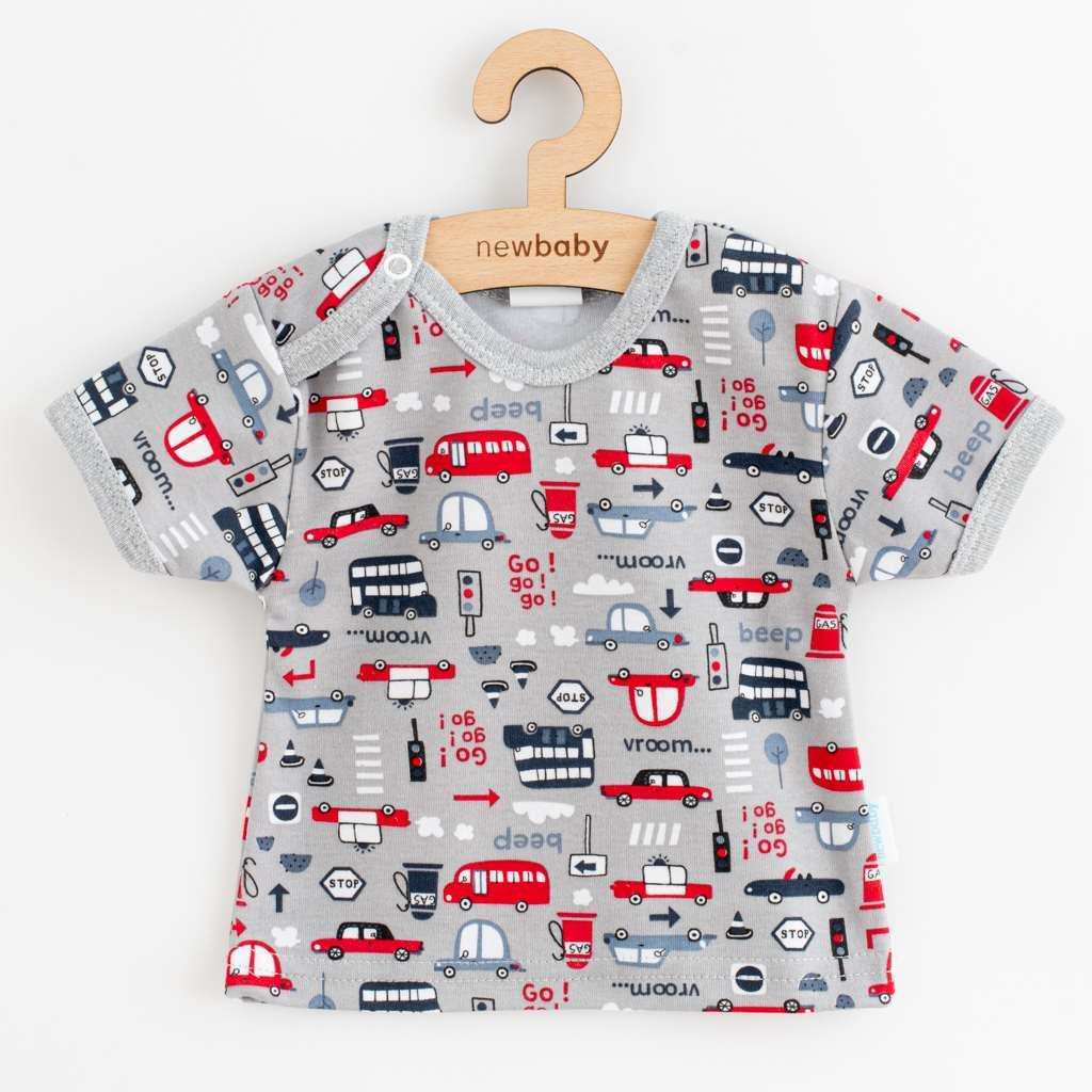 Beautiful cotton baby t-shirt by Czech brand New Baby Go!go!go!. T-shirt with short sleeves printed with cars. Without fastening, over the head. The T-shirt is made with the needs of small children in mind with very comfortable material. 100% cotton. The Go!go!go! collection includes: short-sleeved body, short-sleeved T-shirt, sweatpants and cap and shorts.