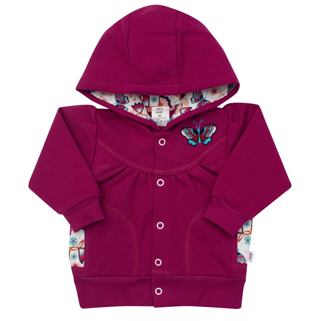 Beautiful stylish and practical girls hoodie with hood of the Czech brand New Baby Little Girl. The sweatshirt has a full-length stud fastening, deeper practical pockets on the sides which are lined with fabric with butterflies and an elasticated hem on the sleeves. The delicately fluted sleeves, embroidered butterfly image and cotton lined hood with butterflies will delight any little girl. The sweatshirt is made of very pleasant material in which your baby will feel very comfortable. Customer satisfaction is very important to New Baby and that is why we offer you a sweatshirt from the New Baby Little Girl collection. 97% cotton, 3% elastane.