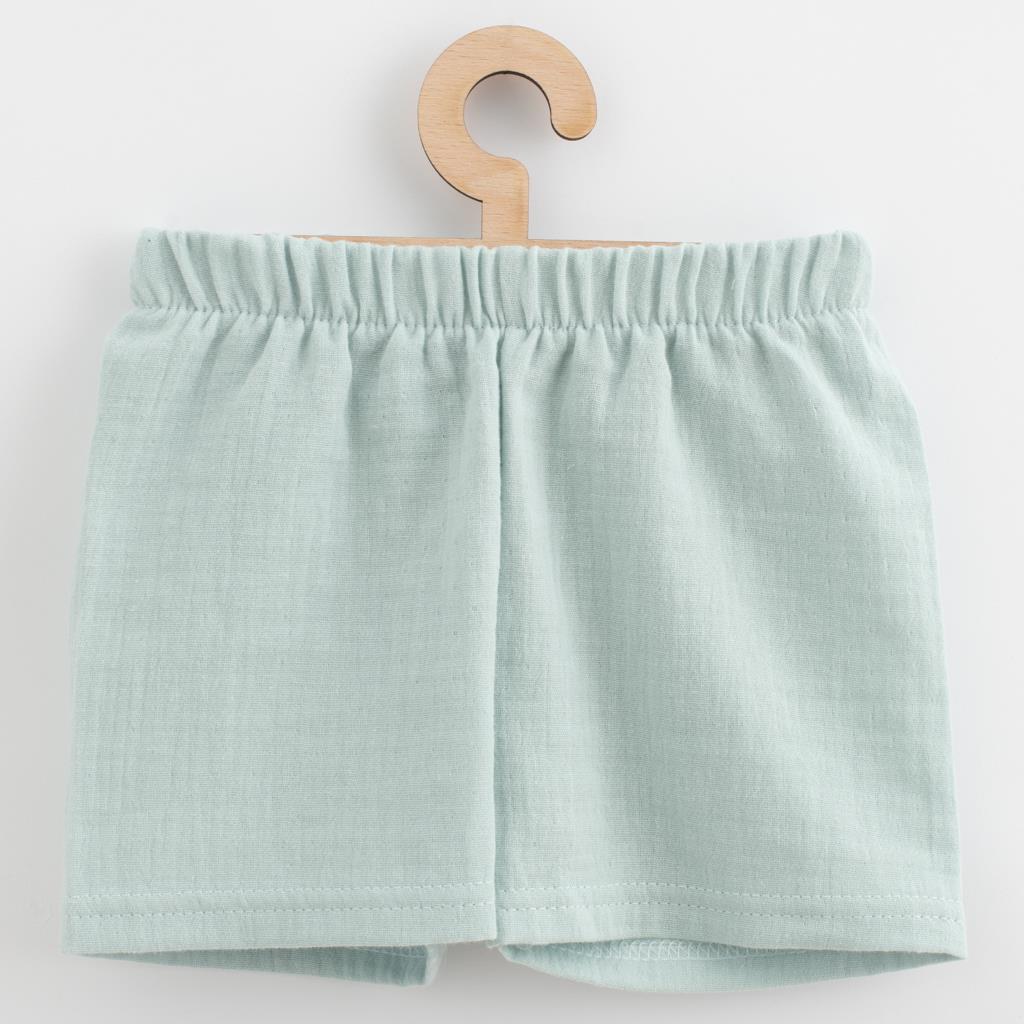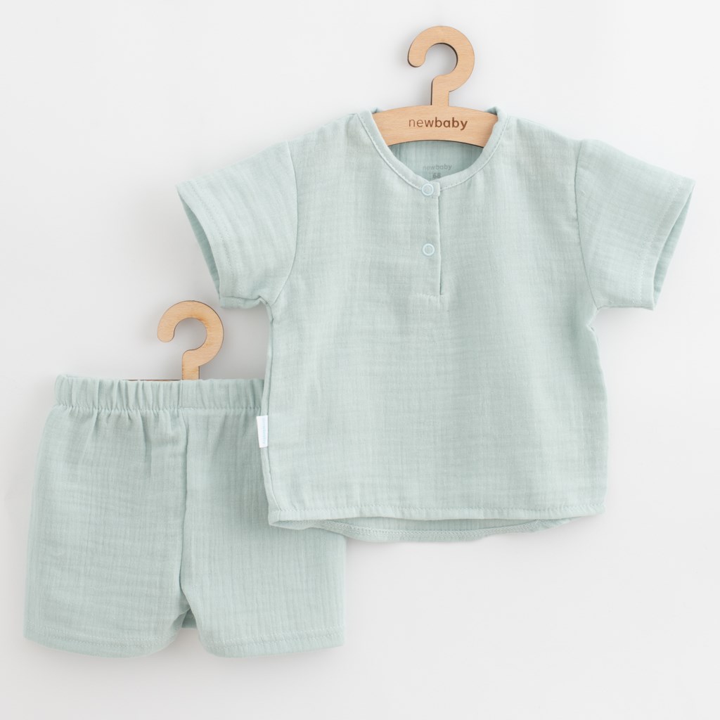 Practical summer 2-piece muslin baby kit for boys by Czech brand New Baby Soft dress. The summer set consists of a T-shirt and shorts. T-shirt has short sleeves and perfect cut. It is fastened under the neck with studs. The shorts have a wider elastic band at the waist, which does not press on the child's tummy. The set is lightweight and very comfortable to wear. 100% cotton. Muslin is one of the purest, simplest and softest fabrics in the world. The finely woven breathable material is so perfect that children all over the world will love it. The lightweight texture allows the muslin to ""breathe"" and ensures sufficient air circulation, reducing the risk of overheating. This feature helps keep your child comfortable, safe and parents calm. The muslin is very durable, so much so that it can easily handle repeated washings and becomes lighter and softer over time.
