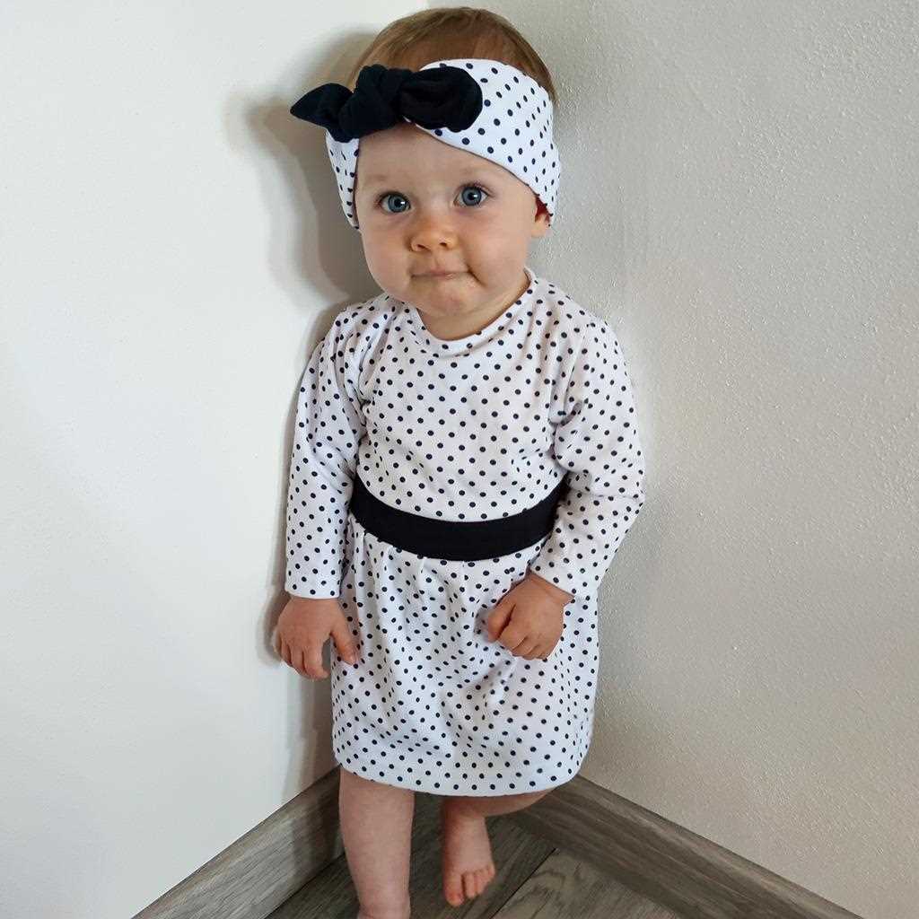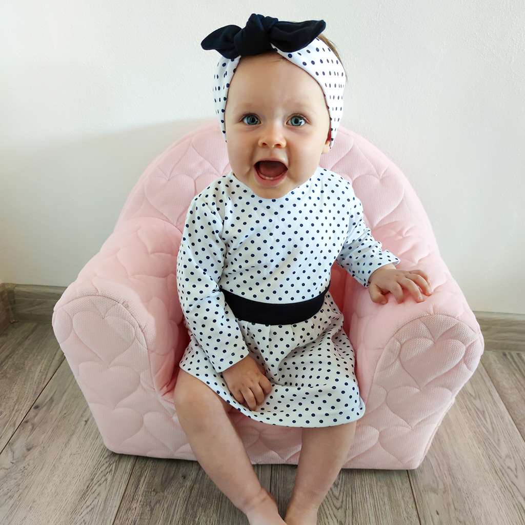 Beautiful cotton baby dress with headband by Czech brand New Baby Teresa II for all little babies. The long sleeved dress with all-over polka dots is sewn in the shape of the letter A. The stud fastening on the shoulder strap makes dressing easier. The dress has a very comfortable and high quality material that is suitable for babies. Beautiful cotton girls headband, will delight all little showgirls. The headband is elastic, adjusts well. 100% cotton.