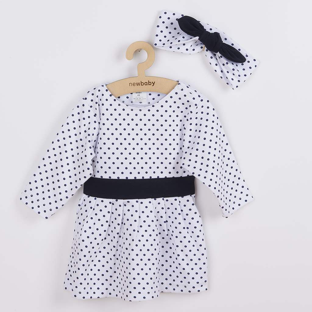 Beautiful cotton baby dress with headband by Czech brand New Baby Teresa II for all little babies. The long sleeved dress with all-over polka dots is sewn in the shape of the letter A. The stud fastening on the shoulder strap makes dressing easier. The dress has a very comfortable and high quality material that is suitable for babies. Beautiful cotton girls headband, will delight all little showgirls. The headband is elastic, adjusts well. 100% cotton.