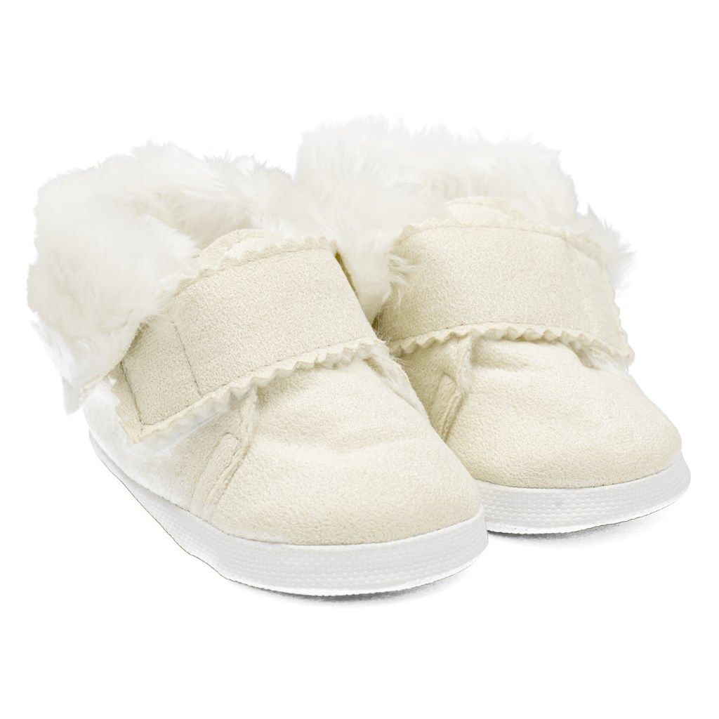 New Baby winter booties for babies. Beautiful, warm, semi-fitted slippers with a modern look and velcro fastening. The inner part is lined with fleece knitted fabric-100% polyester. The slippers fit close to the foot and have a wide inside, allowing free movement of the toes and muscles. The product is not designed for walking. They are very lightweight with a thin synthetic sole. Composition: organic suede - 100% polyester, fleece knitted fabric-100% polyester. Sole: BPA-free synthetic PVC material. Insole length 11 cm. Designed for children 3-6 months. Supplied in a practical box. Please note: sometimes there is a paper liner under the textile liner to hold the shape of the slipper. Remove this paper liner before first use.