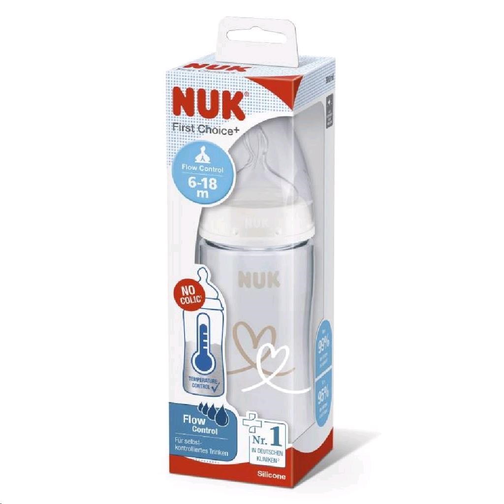 Beautiful NUK First Choice baby bottle with temperature control-Flow Control teat. 6 - 18 months. NUK First Choice+ Flow Control teat: makes the transition to independent drinking easier. The teat is also drip-free. This is due to the innovative Y-shaped opening in the teat, which only opens during sucking and expands depending on the baby's greater sucking strength. This, together with NUK's anti-colic system, ensures a controlled flow. Prevents colic. The NUK anticolic system ensures a smooth flow of liquid nutrition without swallowing air. For a happy tummy. Clinically tested. Due to the extremely natural shape of the NUK teat, babies tolerate it very well. This means they are particularly suitable for babies who are breastfed and bottle-fed at the same time. Calm and safe feeding thanks to NUK temperature control. Temperature control and helps prevent your baby from drinking too hot a feed. The indicator looks like a thermometer, it is placed between the lines and the temperature of the bottle contents changes colour.
