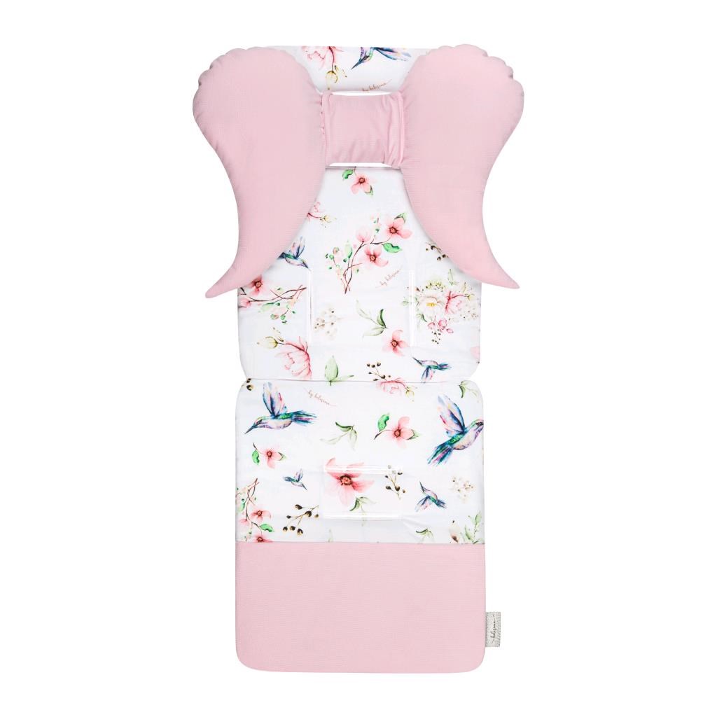 Thanks to the Belisima Hummingbird universal stroller insert, mum can change the look of her stroller. The insert helps to keep the inside of the stroller clean and increases the comfort of travel. In addition, it has holes for seat belts and a belt that can be used to attach a pillow to the insert.