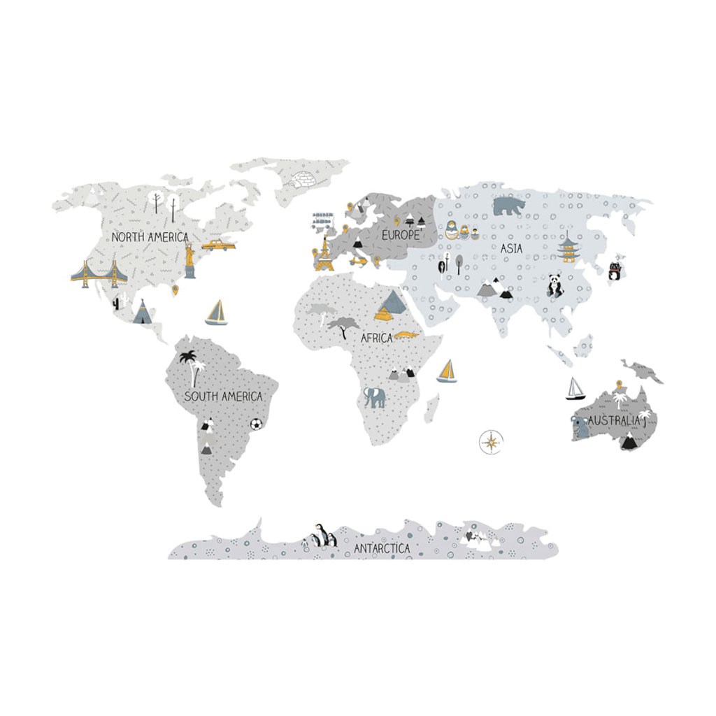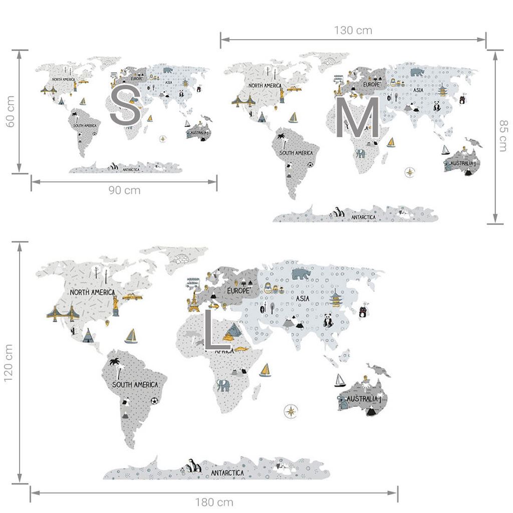 The beautiful wall sticker Map S. Grey World Maps are top quality products, made with the utmost care and attention to detail, kept in muted Scandinavian colours that will fit perfectly into your child's space. Maps are not only a unique decoration, but also a sensational way of learning through play. Children get to know the continents, oceans and cardinal points, as well as the sights and attractions of a region or country. Each element of the map is carefully cut out of the outline and glued separately, which makes it easy to apply, especially in the case of large spaces. The size of the sticker is measured after applying it to the wall, with the continents spaced at the appropriate distance from each other. The sticker is secured with a special matt laminate, which protects it from scratches during daily use and also makes it easier to stick - the film is thicker and easier to transfer to the wall. If you're looking for the perfect way to brighten up your child's room, our wall stickers are the right choice. Order them today and make your child happy.