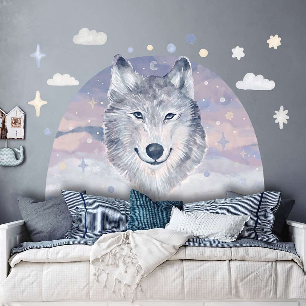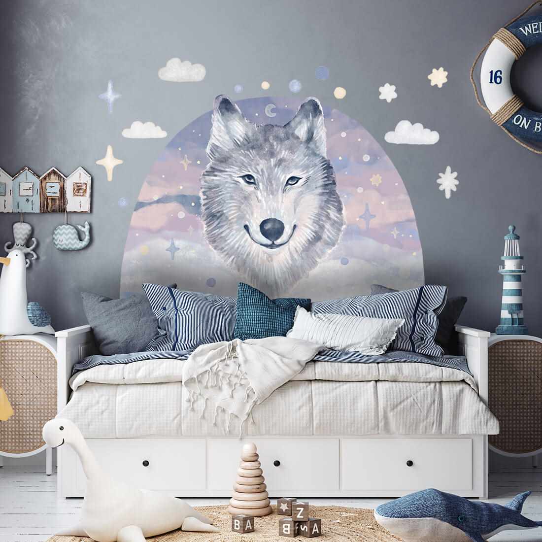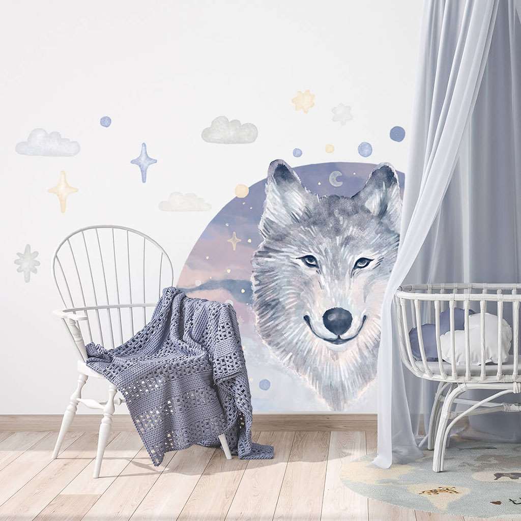 Beautiful wall sticker Wolf. Stickers from this collection will delight with details and harmony of colours, the palette of which has been adapted to the latest trends in interior design. Thanks to this, they will fit perfectly into any children's space. The wolf sticker is a quick and easy way to create a beautiful metamorphosis of a child's space. Thanks to their large surface area, the stickers from this collection are ideal for sticking behind the bed or in the children's corner. The sticker is secured with a special matt laminate that protects it from scratches during everyday use and also makes it easier to stick - the film is thicker and easier to transfer to the wall. If you're looking for the perfect way to brighten up your child's room, our wall stickers are the right choice. Order them today and make your child happy. This set includes: wolf and other elements. The exact dimensions of each sticker part are shown in the last photo.